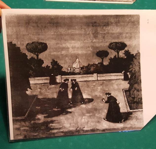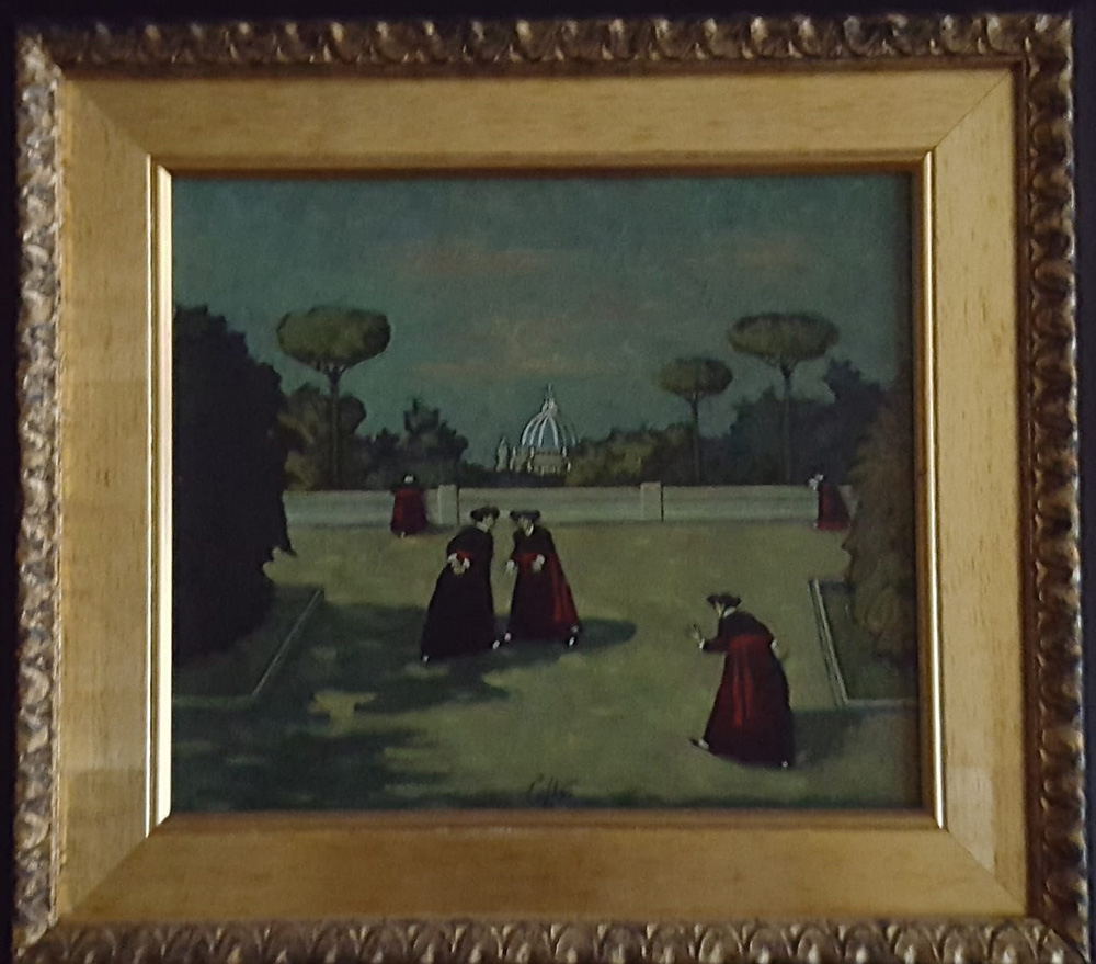 Nino Caffè, Sulla terrazza del Mincio 1973 Olio su tavola, 25cm x 29cm. Archivio n. M1091BM e pubblicato su terzo volume catalogo generale opere di Nino Caffè