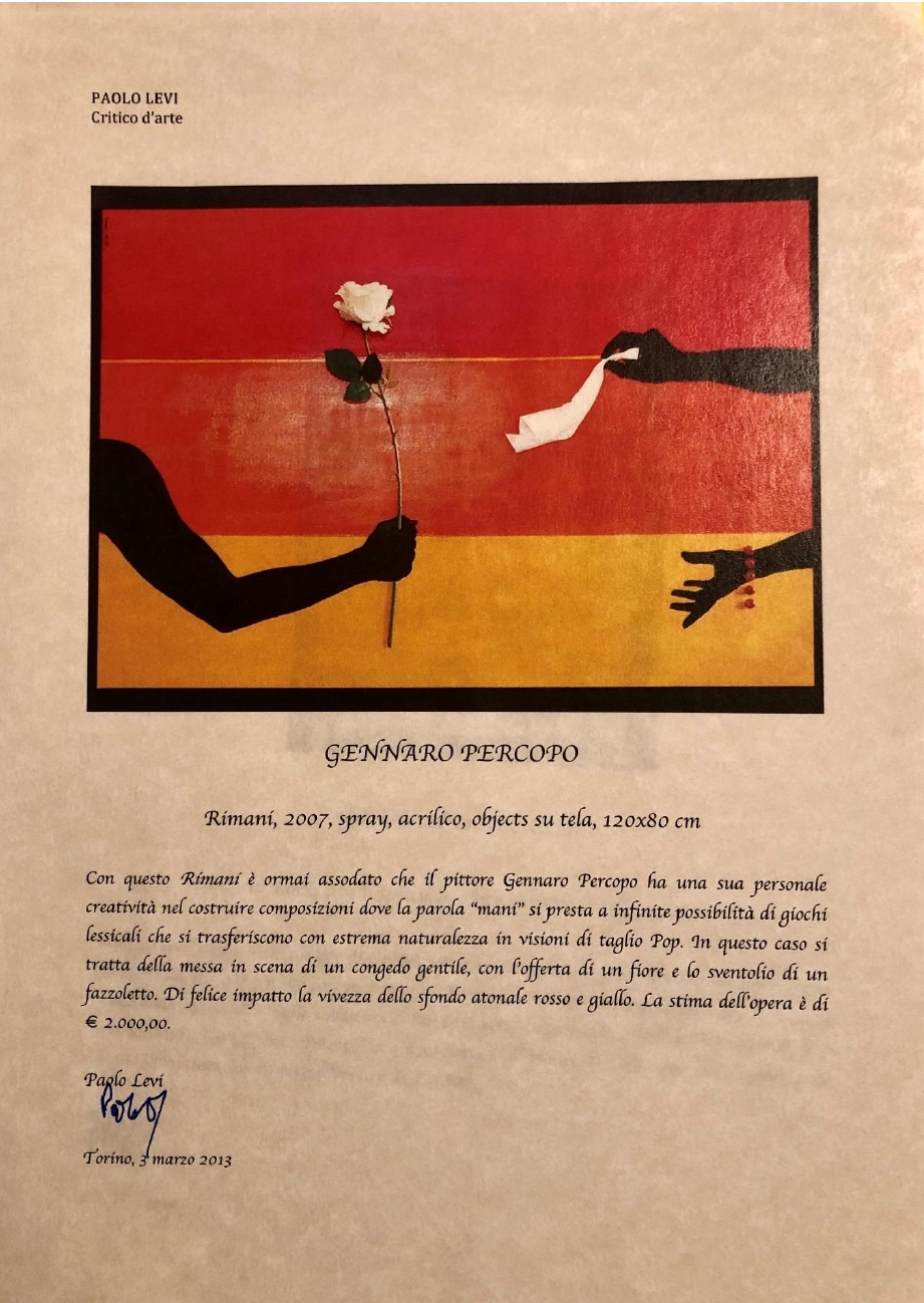 Gennaro Percopo, RiMani 2007 Spray acrilico oggetti su tela, 80cm x 120cm. Critica e valutazione prof. Paolo Levi Torino 3 Marzo 2013