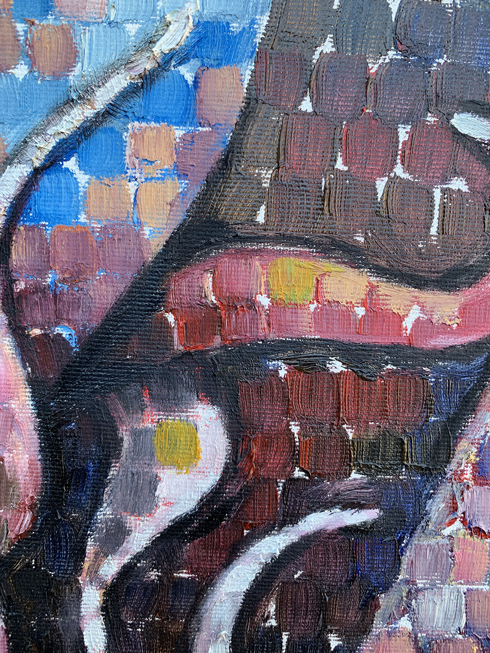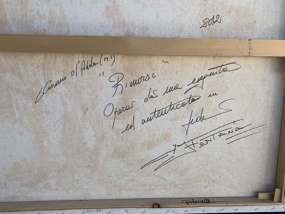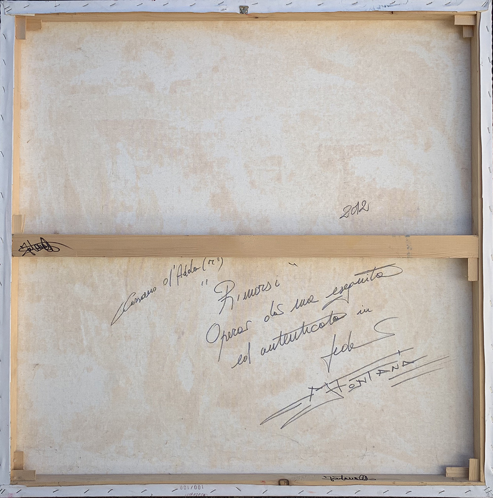 Mario Fontana, Rimorsi 2012 Olio su tela tecnica mosaico, 100cm x 100cm x 3cm. Autentica su foto dell'artista