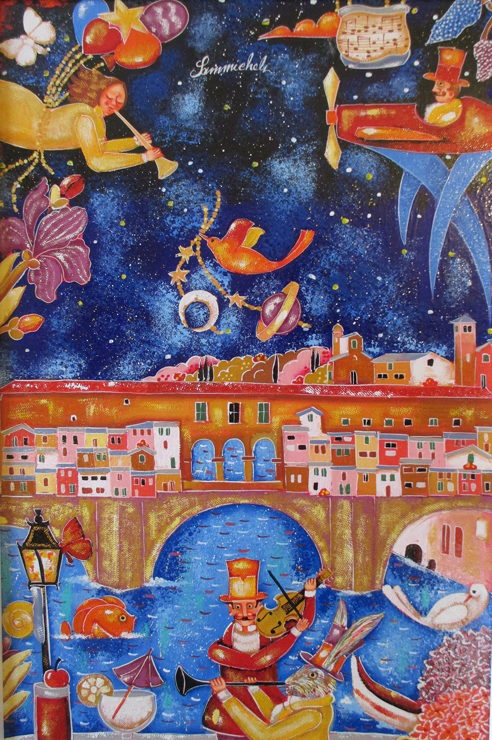 Francesco Sammicheli, Notte al Ponte Vecchio Acrilico su tavola, 48cm x 32cm. Autentica su foto dell'artista