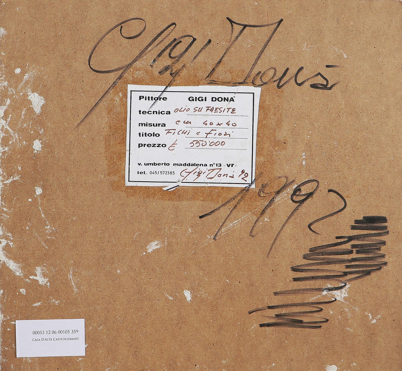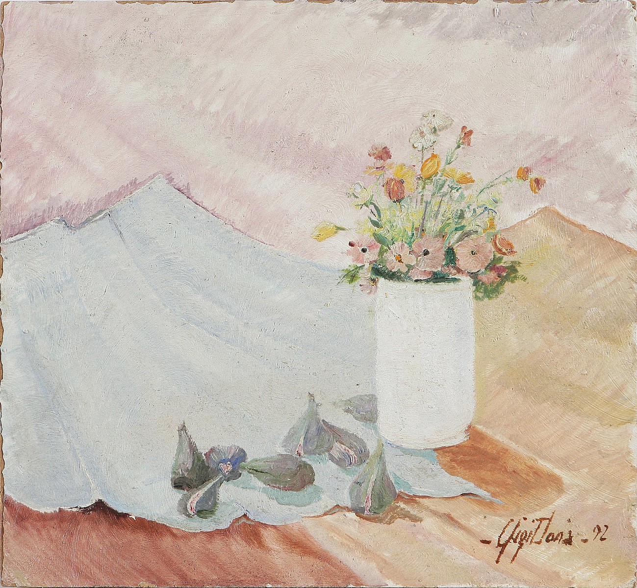 DONA' GIGI Fichi e fiori. 1992. Olio su faesite. Cm 40x40. Al retro firma, data e cartiglio descrittivo. Firma e data in basso a destra.