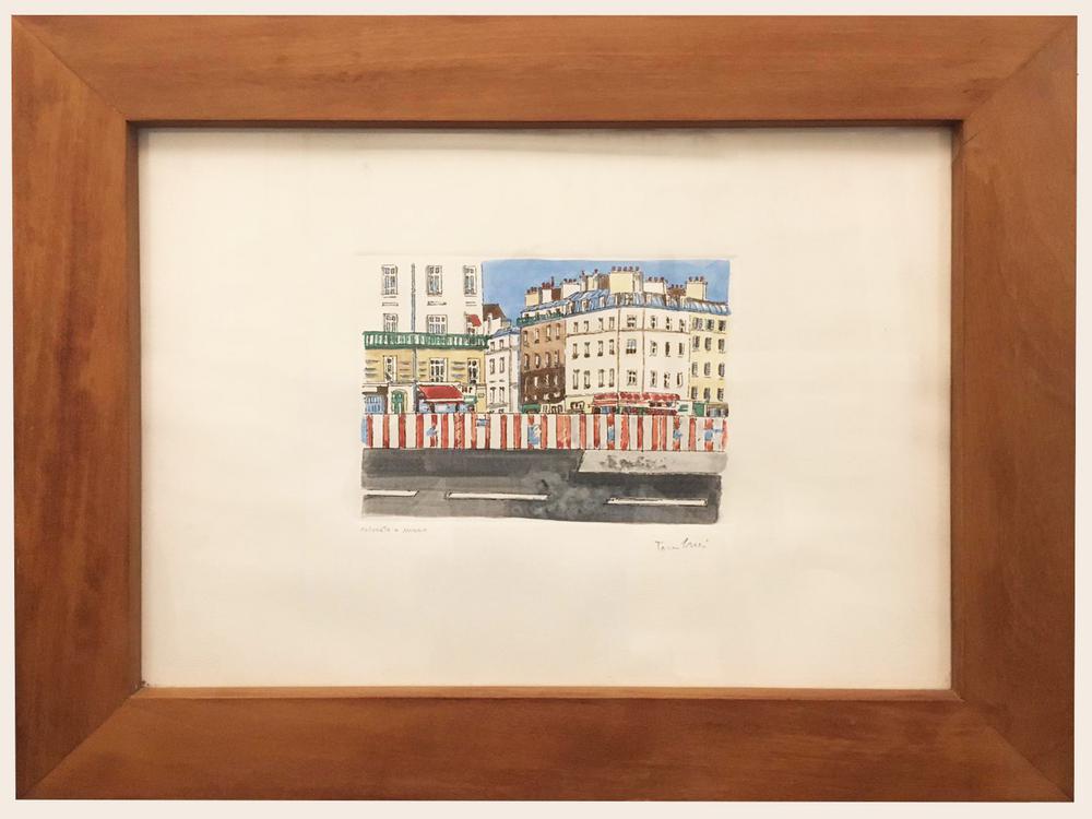 Orfeo Tamburi CASE DI PARIGI acquaforte colorata a mano in grande cornice in ciliegio, foglio cm 45x60, battuta cm 21x28 firmato timbro a secco Intergrafica, Roma