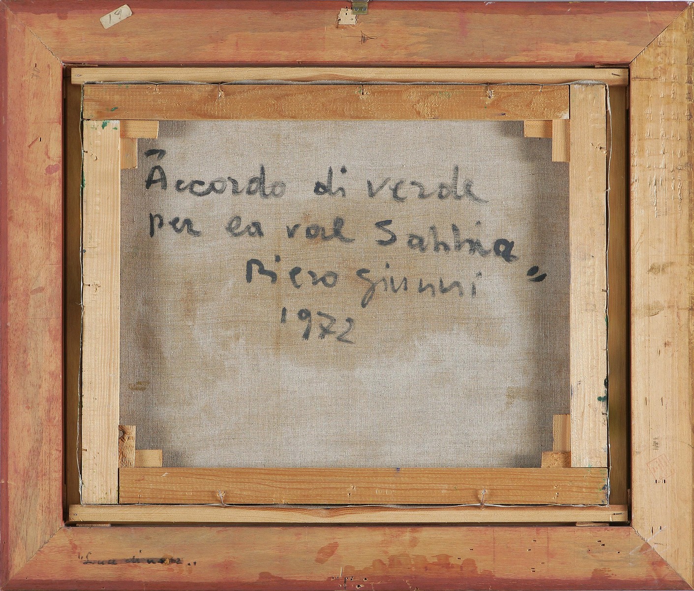 GIUNNI PIERO (1912 - 2000) Accordo di verde per la Valsabbia. 1972. Olio su tela. Cm 50x40. Al retro titolo, firma e data. Firma e data in basso a destra. Cornice presente.