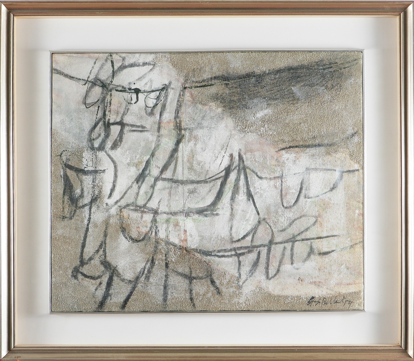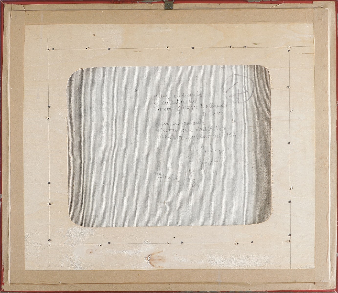 BELLANDI GIORGIO (1930 - 1976) Senza titolo. 1954. Tecnica mista su tela. Cm 60x50. Al retro firma per autentica di Enzo Pagani. Firma e data in basso a destra. Cornice presente.