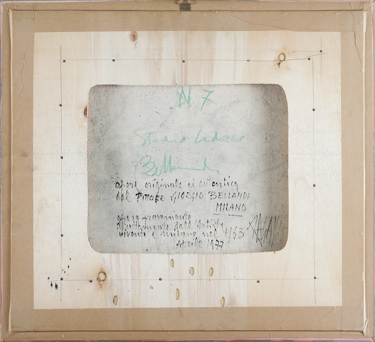 BELLANDI GIORGIO (1930 - 1976) Studi lirico. 1963. Tecnica mista su tela. Cm 46,5x52,5. Al retro titolo, firma dell'autore, firma per autentica e provenienza di Enzo Pagani. Firma in basso a sinistra. Cornice presente.