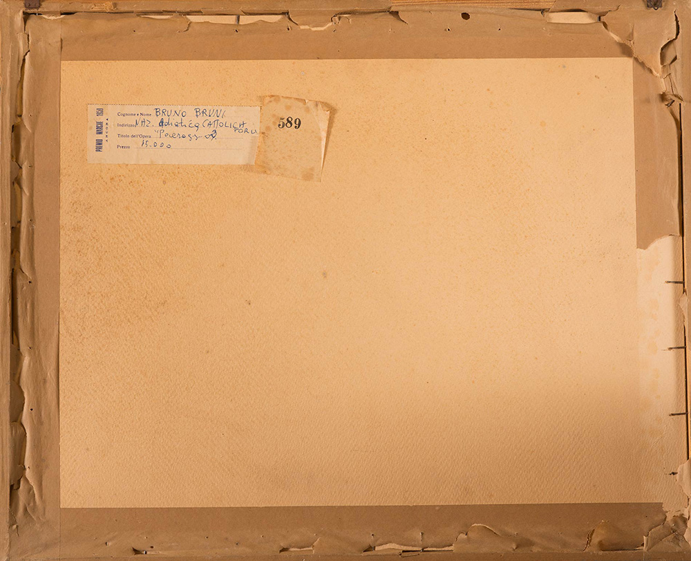 Bruno Bruni (Gradara 1935), “Paesaggio”, 1959. Tecnica mista su carta, firmato e datato in basso a destra Bruno Bruni 59, H cm 33.5x44.5 Al retro reca etichetta Premio Marche 1959 – Ancona.