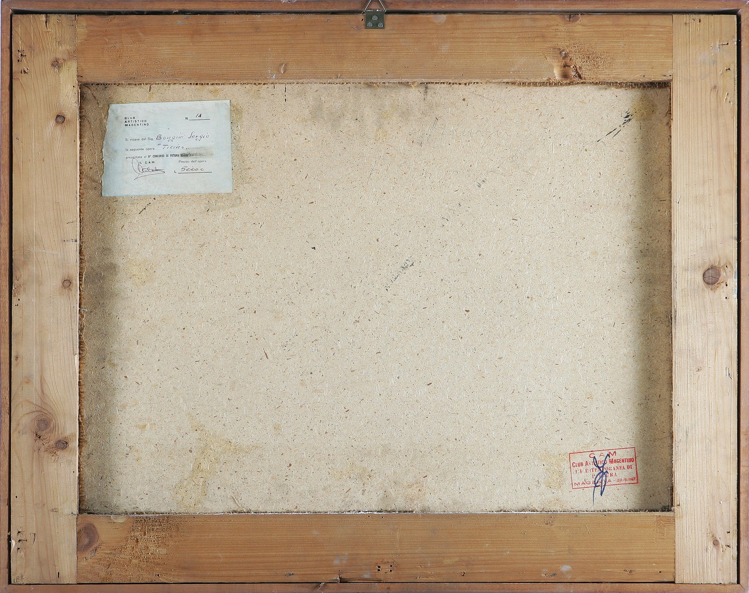 BONGINI SERGIO (1936 - 2011) Ticino. 1962. Olio su tavola. Cm 64,5x48,5. Al retro cartiglio e timbro del Club Artistico magentino Estemporanea di pittura, Magenta. Firma e data in basso a destra. Cornice presente.