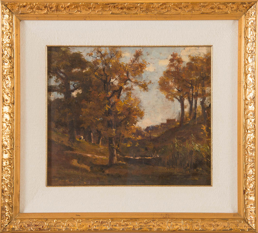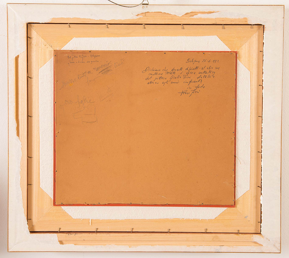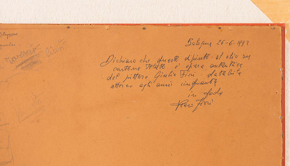 Giulio Fiori (Bologna 1909 - 1991), “Paesaggio”, Anni ‘50. Olio su tela applicata su cartone, H cm 35.5x41 Al retro reca autentica del figlio Piero Fiori in data 1992.