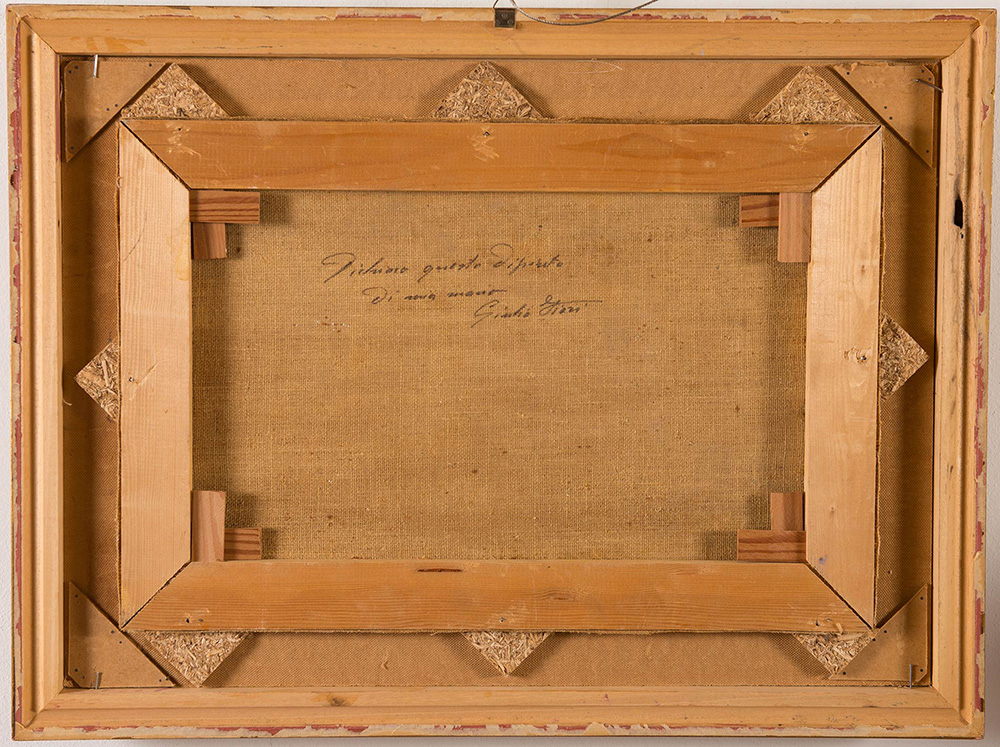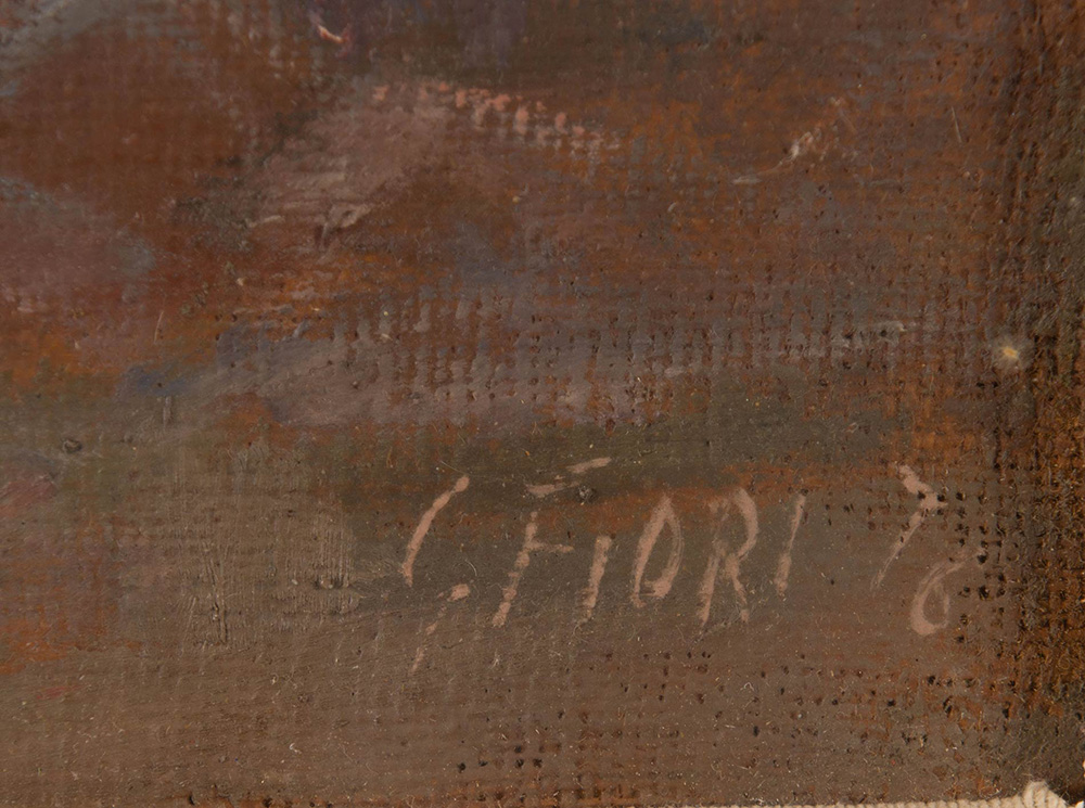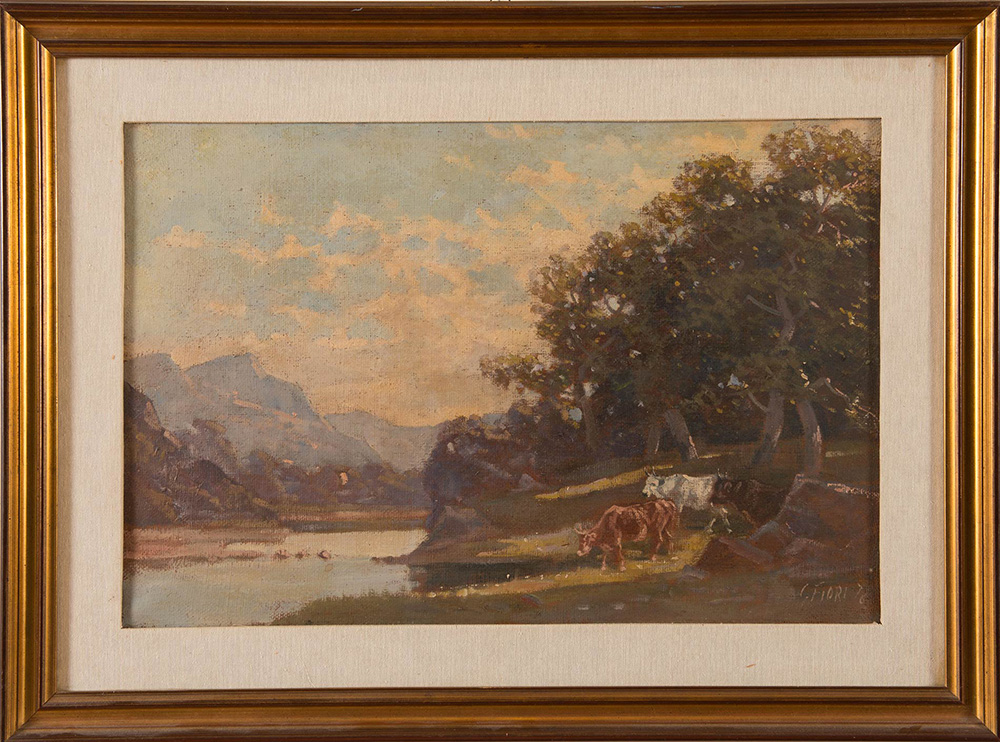 Giulio Fiori (Bologna 1909 - 1991), “Paesaggio con armenti’, 1976. Olio su tela, firmato e datato in basso a destra Giulio Fiori 76, H cm 40.5x60.5 Al retro reca scritta per autentica ‘Dichiaro questo dipinto di mia mano Giulio Fiori’.