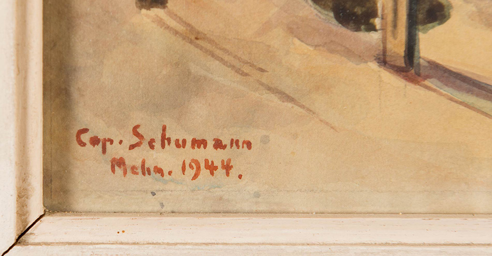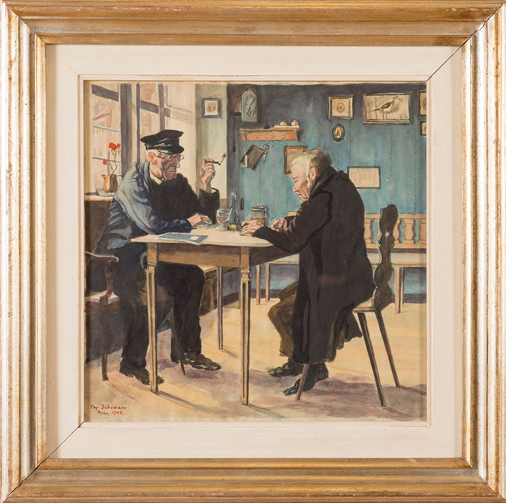 Lot 200 | Pittore del XX sec., “Interno con figure”, 1944. Acquerello su carta, firmato...