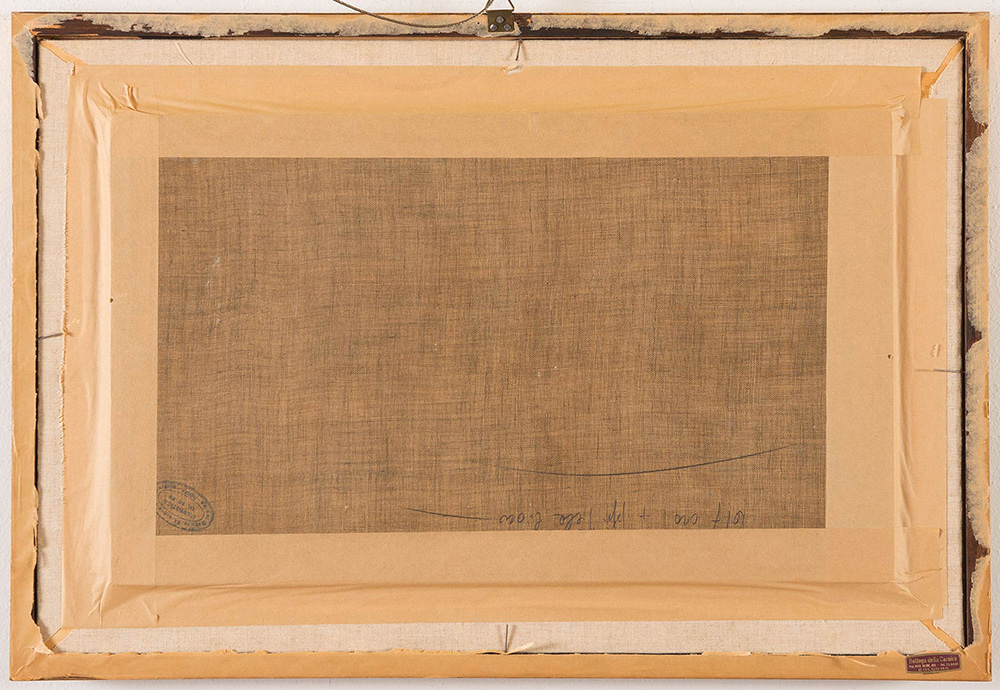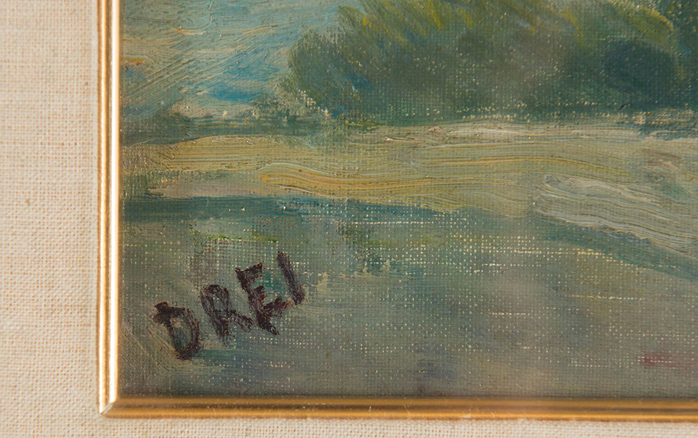Ercole Drei (Faenza 1886 – Roma 1973), “Paesaggio lacustre”. Olio su cartone telato, firmato in basso a sinistra Drei, H cm 30x50 Al retro reca timbro L’Artistica – Roma.