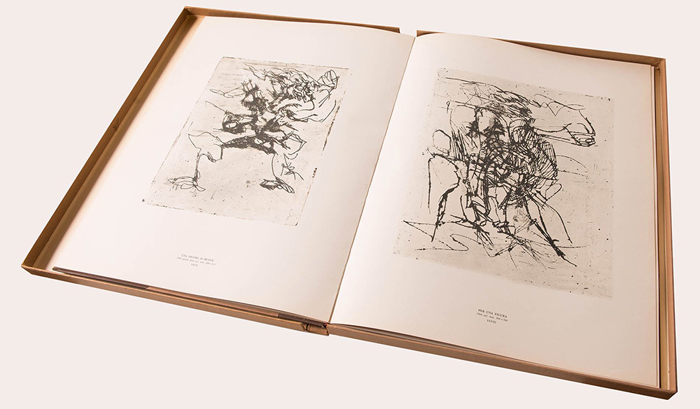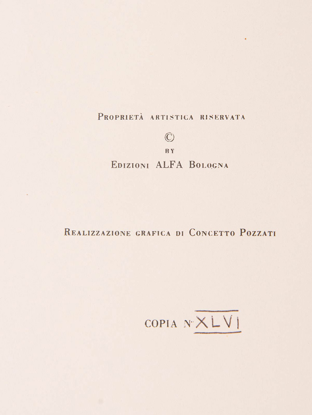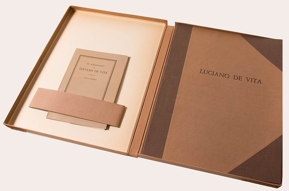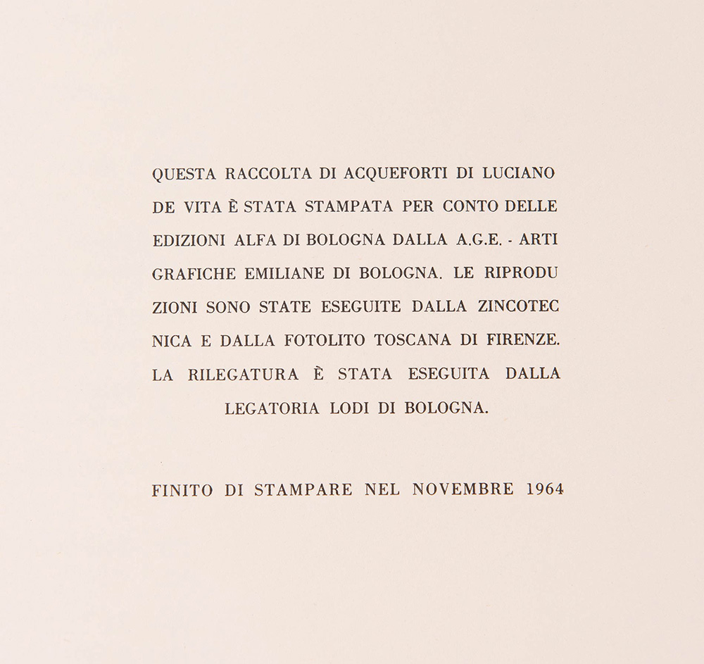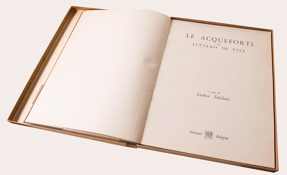 Luciano De Vita (Ancona 1929 – 1992), “Le acqueforti di Luciano de Vita”. Opera contenente le acqueforti di Luciano De Vita, a cura di Andrea Emiliani, Edizione Alfa - 1964, illustrato da 46 riproduzioni delle opere di de Vita. Tiratura di sole 80 copie numerate, la nostra porta il n. XLVI. L’opera è accompagnata da cofanetto originale in cartone rigido di dimensioni 43x56x3.5