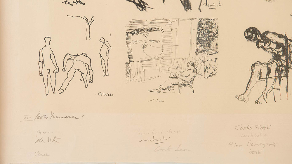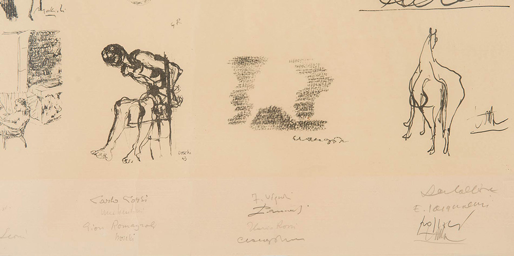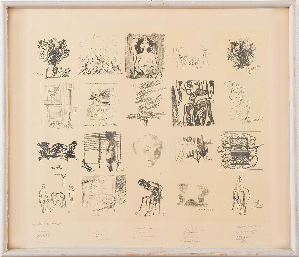 Opera composta da venti litografie in un unico foglio. Con firme originali dei seguenti artisti: Manaresi, Biasion, De Vita, Corazza, Guidi, Cuniberti, Mattioli, Leoni, Corsi, Bendini, Romagnoli, Boschi, Vignoli, Pancaldi, Rossi, Cinagottini, Colliva, Pasqualini, Pozzati, Tomba, H cm 67x77
