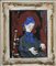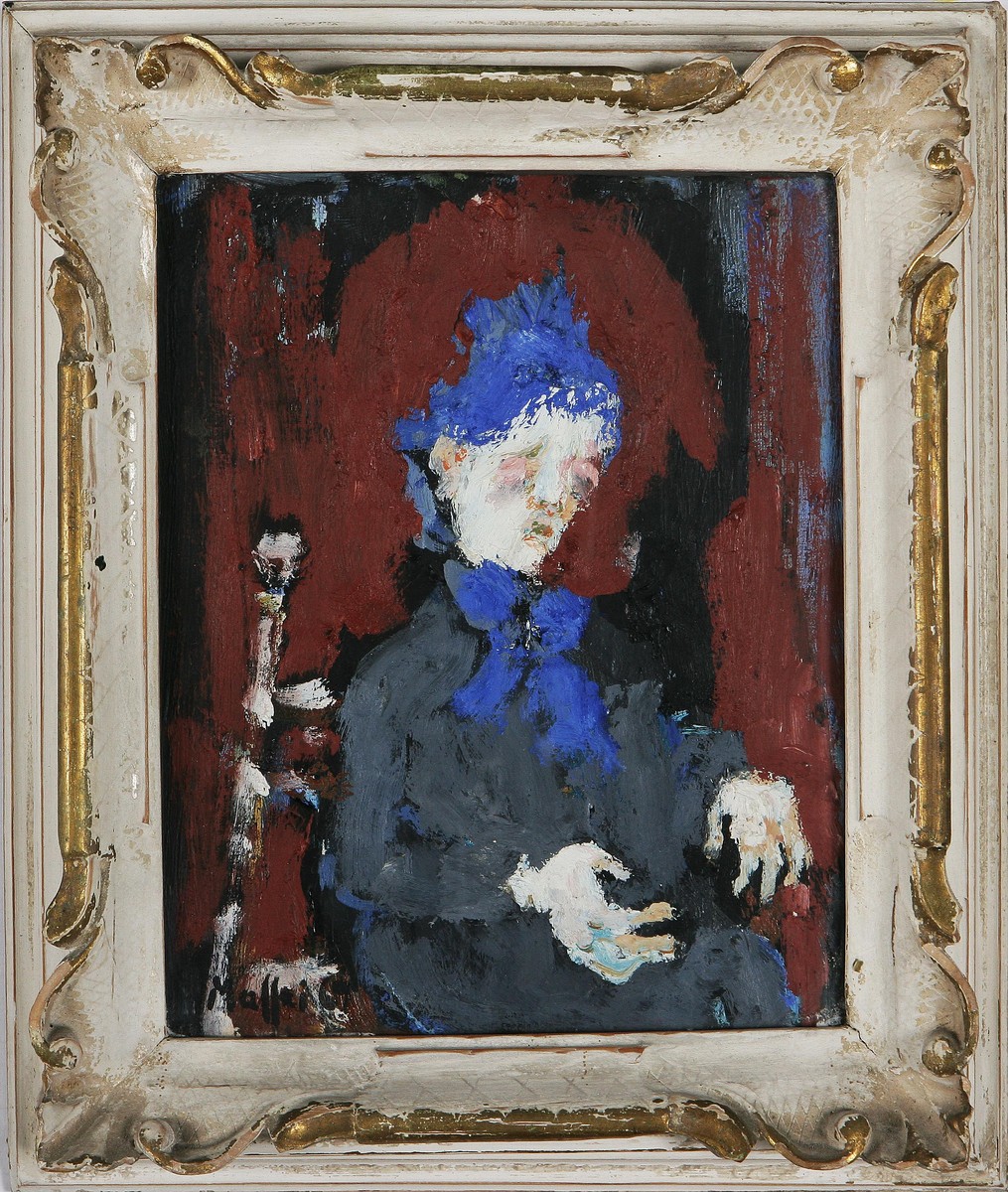 MAFFEI GINA (n. 1946) La vecchietta col cappello blu. 1969. Olio su tavola. Cm 20x25. Al retro titolo, anno e cartiglio della Galleria d'arte Maggiolini. Firma e data in basso a sinistra. Cornice presente.