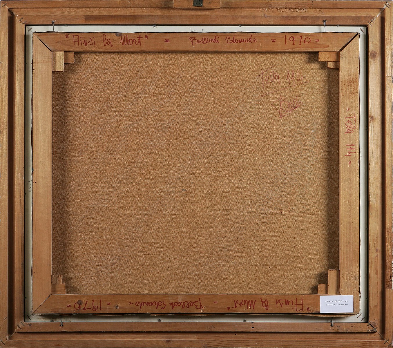 BELLODI EDOARDO (1920 - 2000) Ainsi la mort. 1970. Olio su tela. Cm 70x70. Al retro sul telaio titolo, firma e anno. Firma e data in basso a sinistra. Cornice presente.