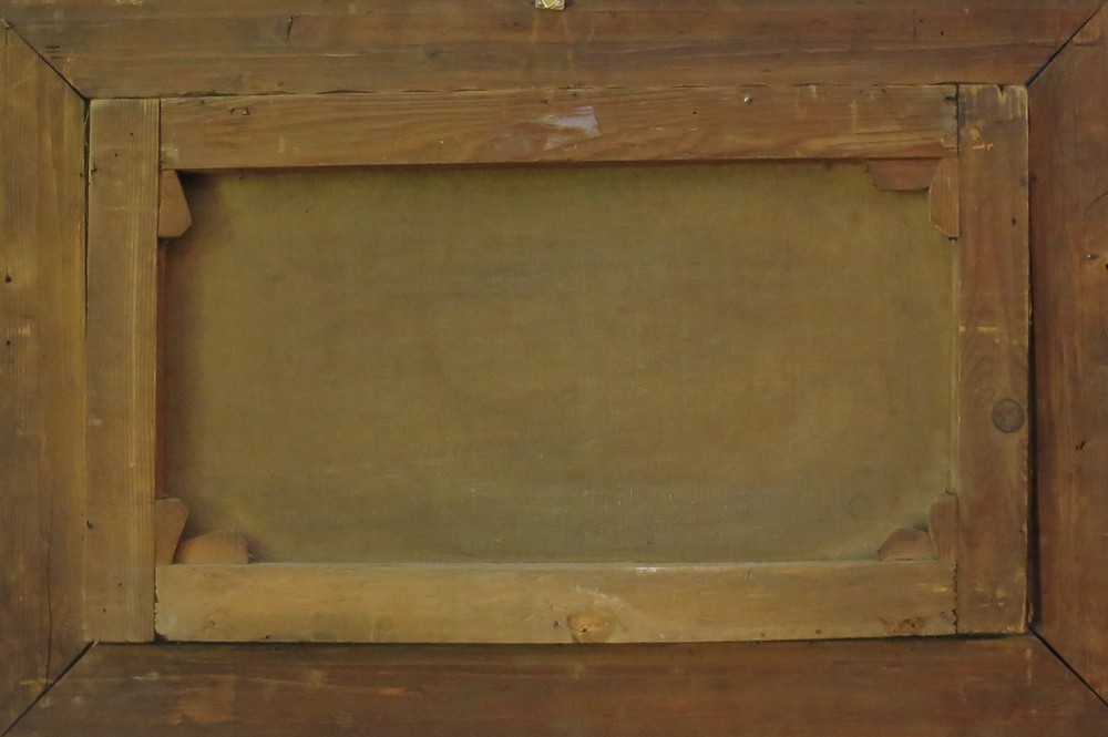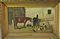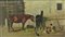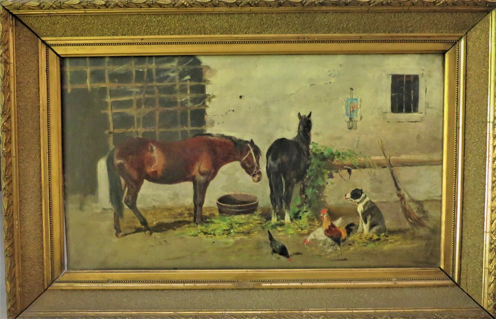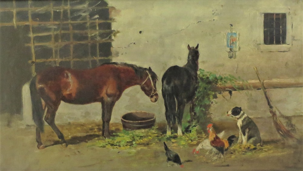 ARTISTA FRANCESE DEL XIX SEC. "Cavalli e animali sull'aia" Olio su tela firmato in basso a destra cm 30x52