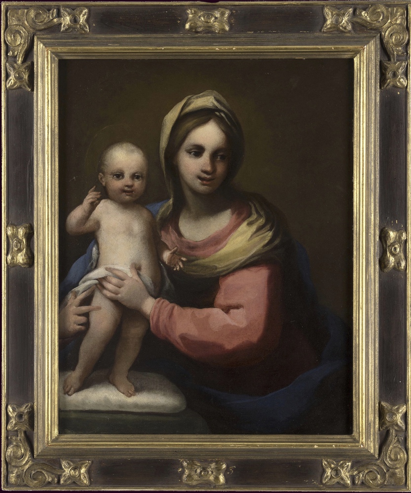 MAESTRO TOSCANO DEL XVII SEC. "Vergine e Gesù Bambino benedicente" Olio su tela cm 73x58,5 Di ottima mano, sapiente e delicata, dal colorismo tenue si inserisce perfettamente nello stile del primo barocco mediceo.