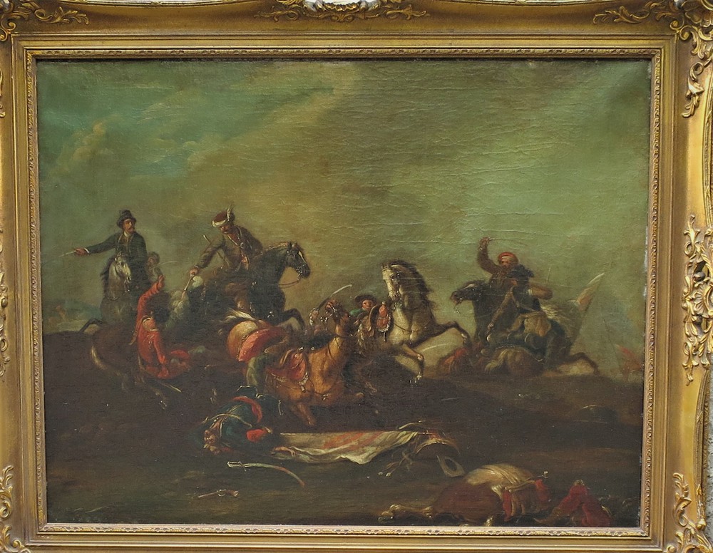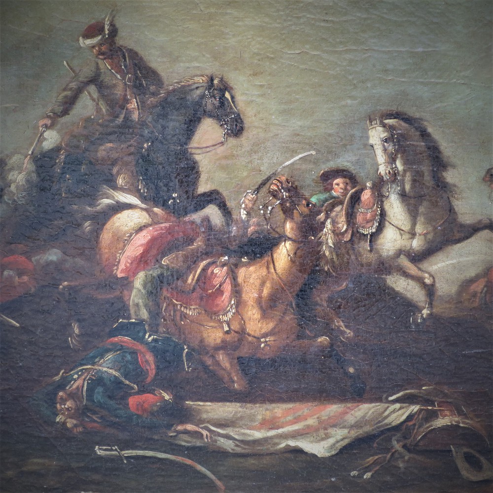 PITTORE ROMANO ATTIVO NEL XVIII SEC. "Scontro tra cavalieri" Olio su tela cm 68,5x88 L'opera presenta molte affinità stilistiche con l'arte del Borgognone, soprattutto per quanto riguarda il cavallo bianco e, in questo caso anche scosso, presente al centro della tela. Per questa peculiarità l'opera va attribuita ad un seguace del Courtois e molto prossima a Christian Reder, detto Monsù Leandro.
