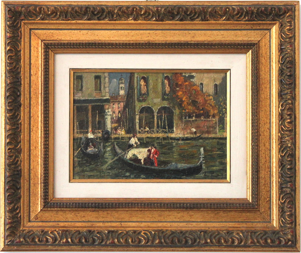 ERMA ZAGO (Bovolone 1880-Milano 1942) "Gondole a Venezia" Olio su tavola cm 18,5x 26 Nato in provincia di Verona e milanese d'adozione Ermanno Giovanni Zago, in arte Erma, divide la sua carriera dipingendo vedute veneziane e milanesi. Tanto veloce e materico nella pennellata quanto brioso nelle tinte, offre in ogni sua opera un'espressione raggiante delle due città. Espone a Milano, Torino, Roma, Fiume e alla Biennale d'arte di Venezia nel 1928 e 1940.