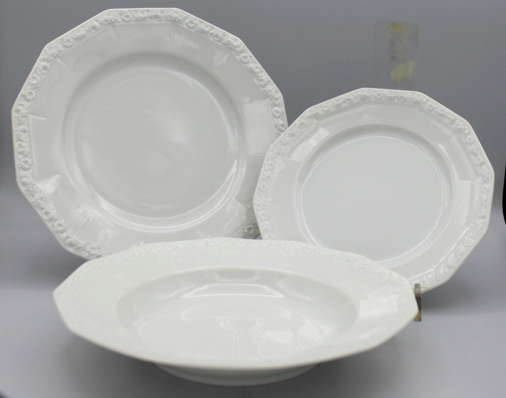 MANIFATTURA DI ROSENTHAL servizio di piatti da 12 modello maria in ceramica bianca composto da 2 zuppiere, 1 salsiera, 7 piatti da portata, 1 teiera, 1 caffettiera, 2 bricchi, 14 fondine, 24 piatti piani 12, piatti medi, 12 pezzi da servizio da t�, 4 piccoli vassoi, 1 zuccherier, 1 lattiera, 12 ciotole da macedonia, 12 sottobicchieri, 8 porta uovo, 12 servizio da brodo, 12 servizio caffè.
