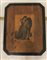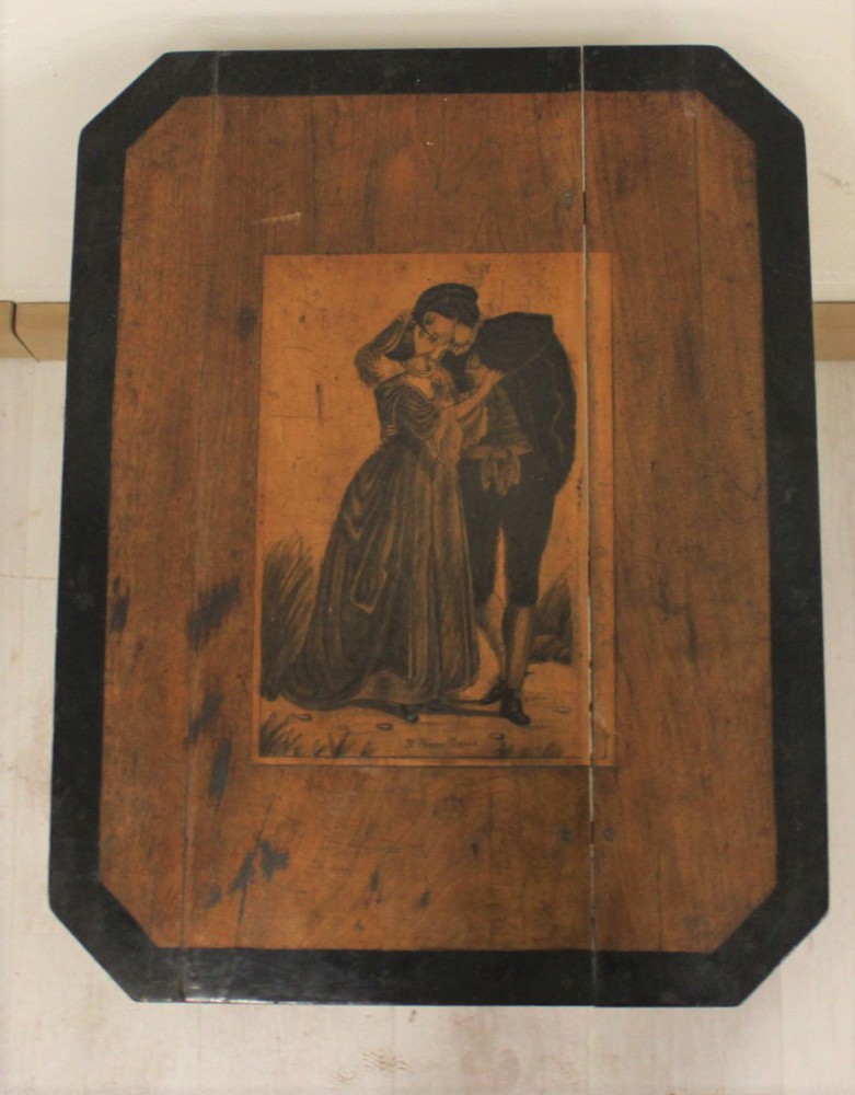 TAVOLINO in legno di tiglio anilinato, piano in noce riquadrato da cornice. Grande riserva interna con dipinto galante. Gamba tornita poggiante su tripode Lombardia XIX sec.