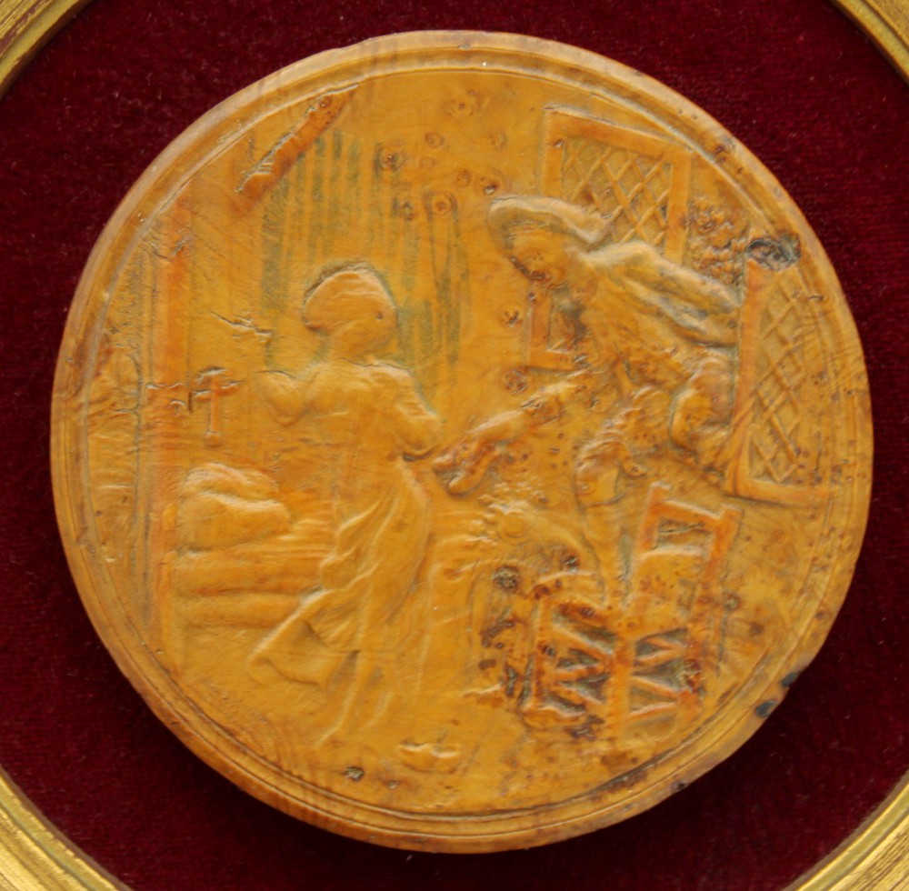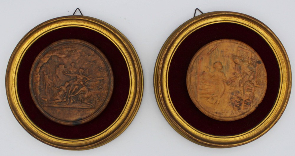 COPPIA DI ANTICHE PLACCHE Due antiche placche in legno raffiguranti scene mitologiche. cm 9
