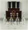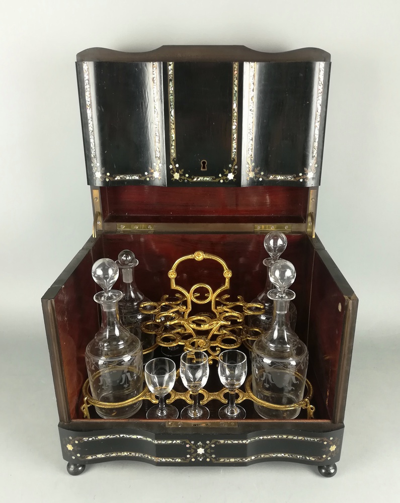 TANTALUS Tantalus in legno ebanizzato con intarsio in madreperla All'interno quattro decanter e quattro bicchieri. Fine XIX secolo. Mancante di dodici bicchieri e di un piede di appoggio. cm 28x32