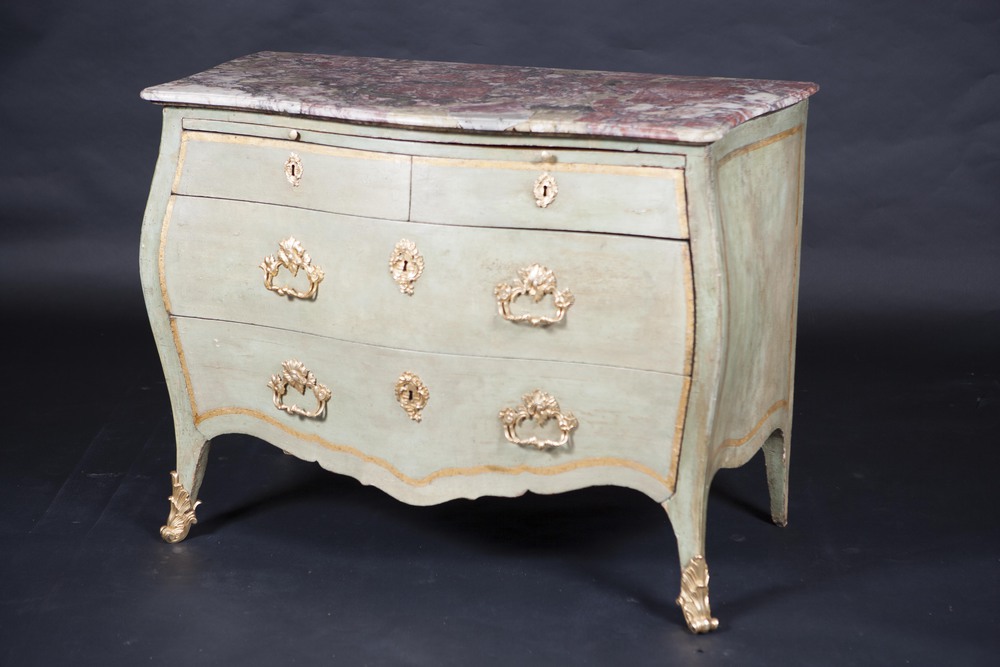 CASSETTONE in legno laccato con applicazioni in bronzo dorato, bombato al fronte e lati, grande tiretto sottopiano. Piano in marmo fiore di pesco. Italia settentrionale XVIII sec.