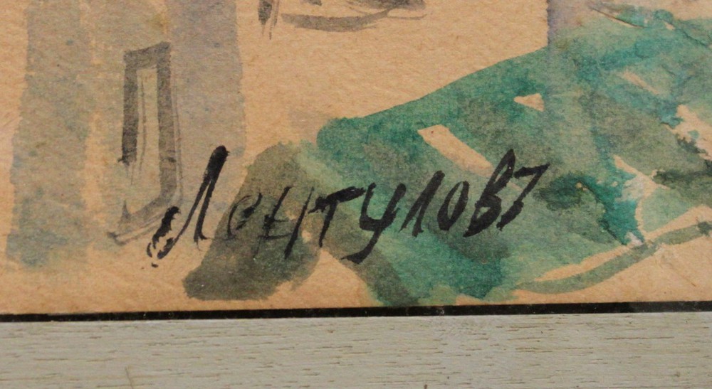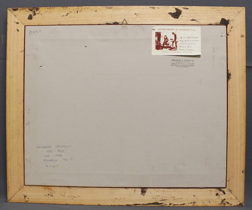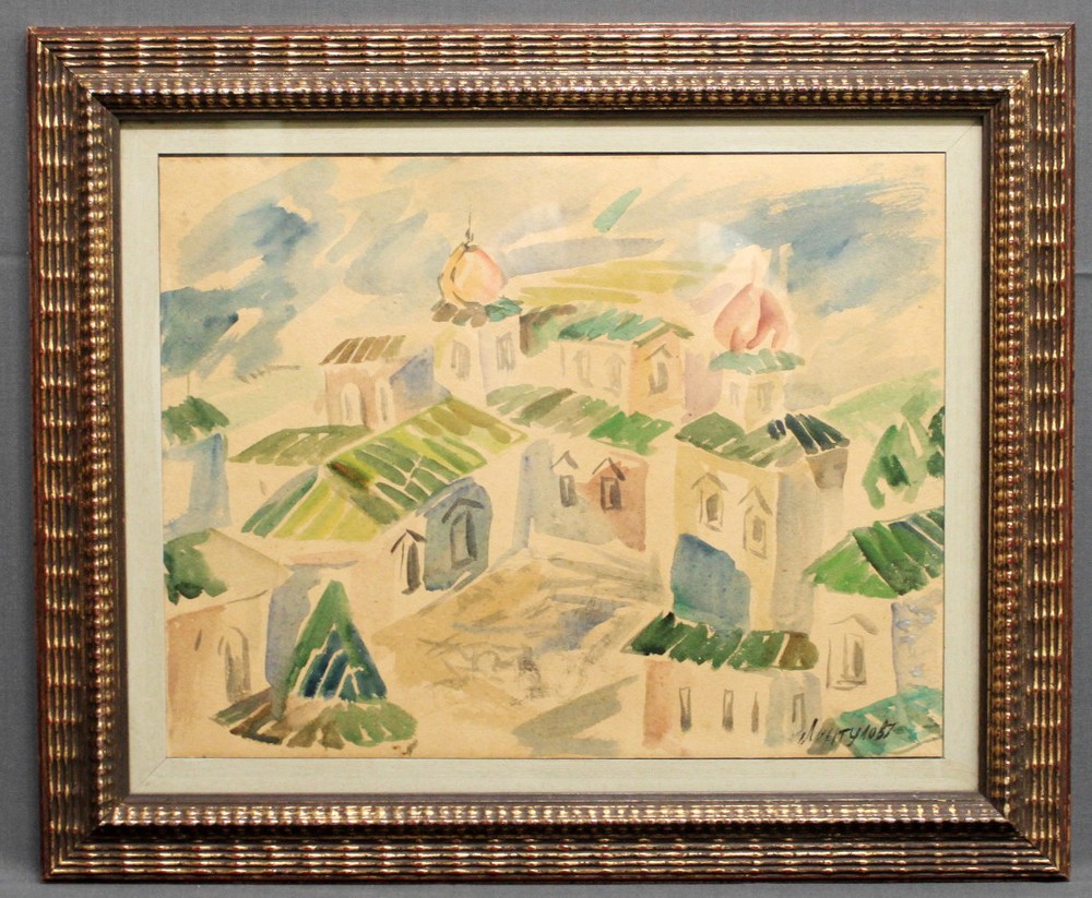 PITTORE ATTIVO ALL'INIZIO DEL XX SEC "Paesaggio con case e chiese" acquerello su carta firmato in basso a destra anni ' 15 - '20 cm 34x44 Cartiglio e timbro dell'antiquariato il cancello,Novara con certificato del Dott. Cesare Lisandria.
