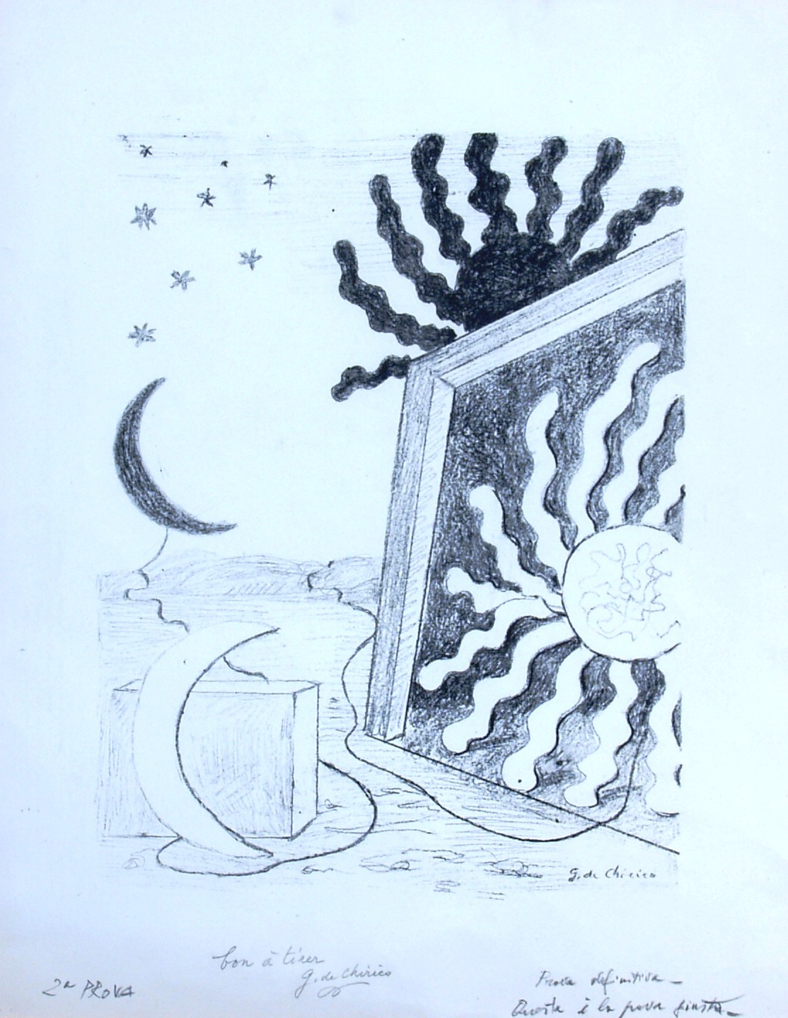 In basso al centro: "Bon a tirer G. De Chirico". In basso a sinistra:" 2° prova". In basso a destra: "prova definitiva. Questa è la prova giusta". Firmato in lastra.