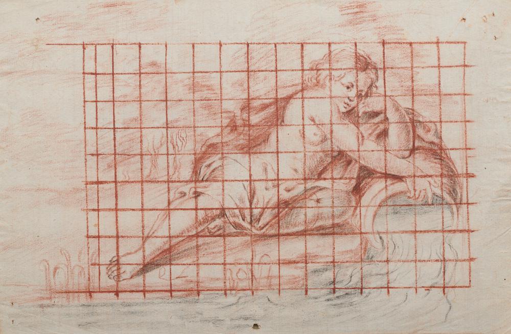 Scuola Italiana del XVIII secolo DIVINITA' FLUVIALE Matita rossa e nera quadrettato a matita rossa. mm 218x330.