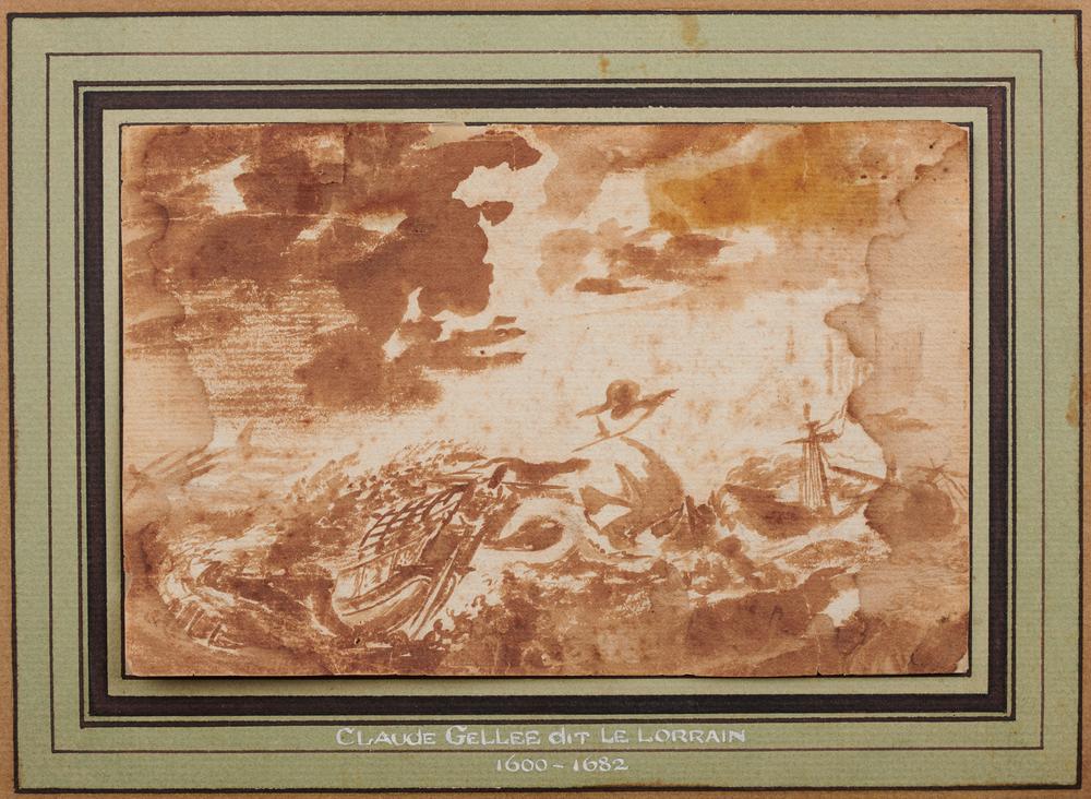 Scuola Francese del XVII secolo NAVI NELLA TEMPESTA Penna e inchiostro bruno. mm 105x160.