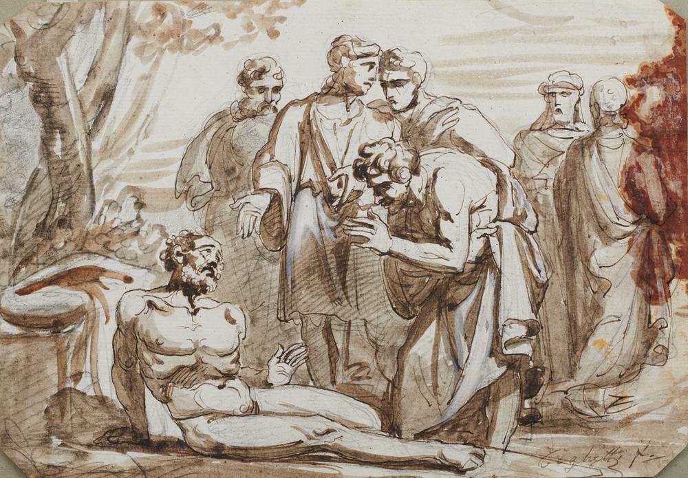 Scuola Neoclassica DIOGENE (?) Penna e inchiostro bruno, matita di grafite e rialzi a tempera bianca. mm 175x252. Firmato 'Coghetti f.'.