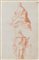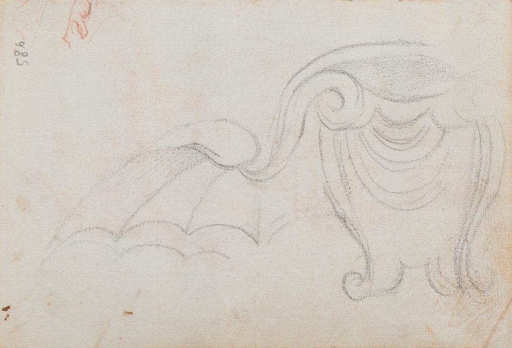 Scuola Emiliana del XVII secolo SECURITAS E GIUSTIZIA Matita rossa e inchiostro rosso. mm 194x130. Al verso: Studio per decoro ad ala di pipistrello. Matita di grafite.
