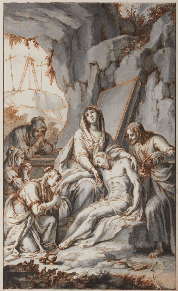 Scuola Emiliana del XVIII secolo LA DEPOSIZIONE NEL SEPOLCRO Penna e inchiostro bruno e nero. mm 325x195.