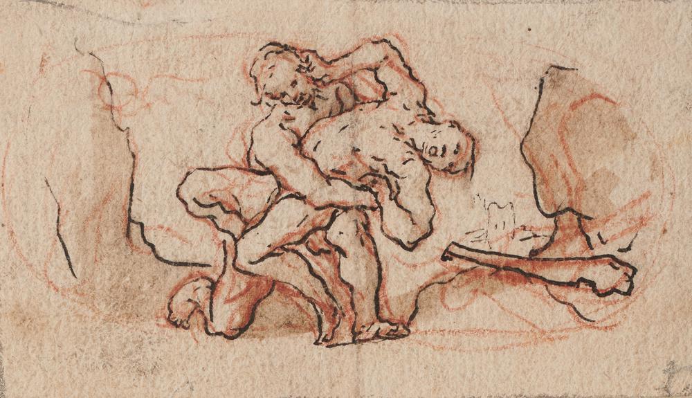 Pier Francesco Mola [cerchia di] (1612 - 1666) COPPIA DI DISEGNI DALLE FATICHE DI ERCOLE Ercole e Caco. Penna e inchiostro nero e matita rossa. mm 60x105. Ercole e il toro di Creta. Penna e inchiostro nero e matita rossa. mm 60x105. (2)