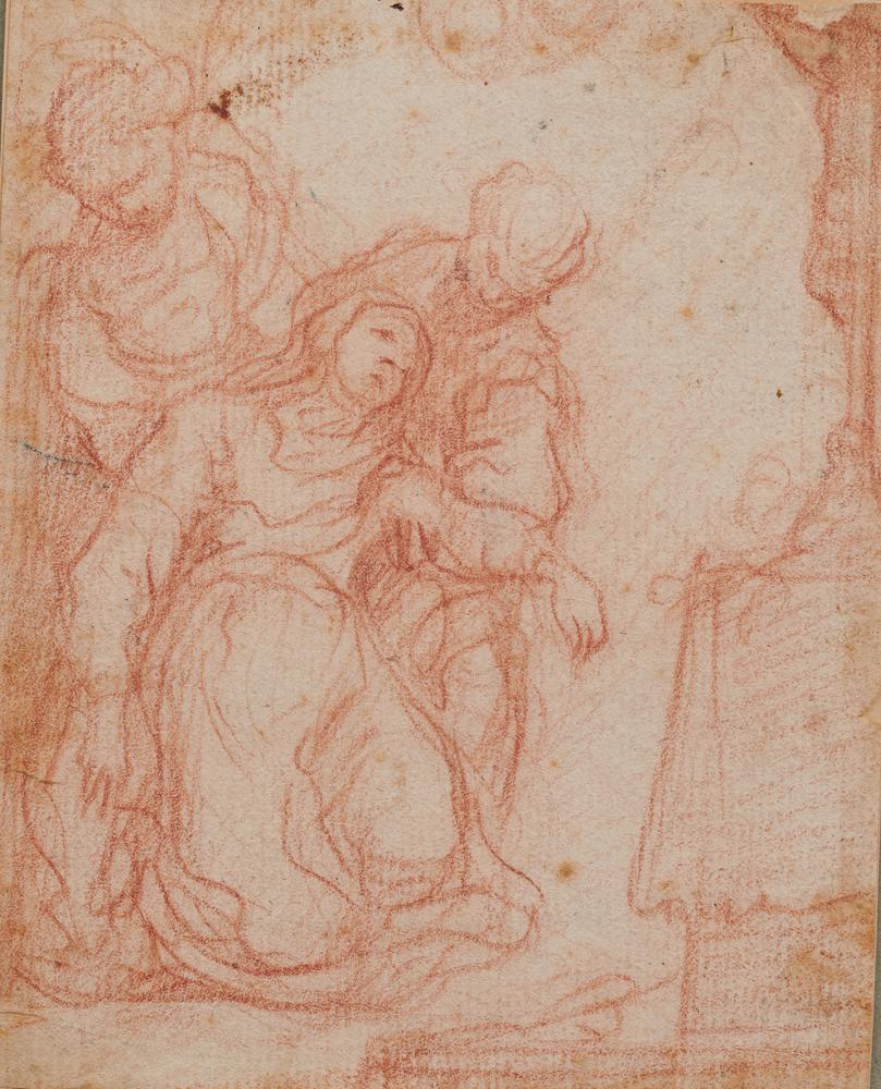 Scuola Emiliana del XVII secolo LOTTO DI 2 DISEGNI La pietà. Matita rossa. mm 149x130. Santa in estasi sorretta da due figure. Matita rossa. mm 160x127. (2)