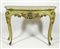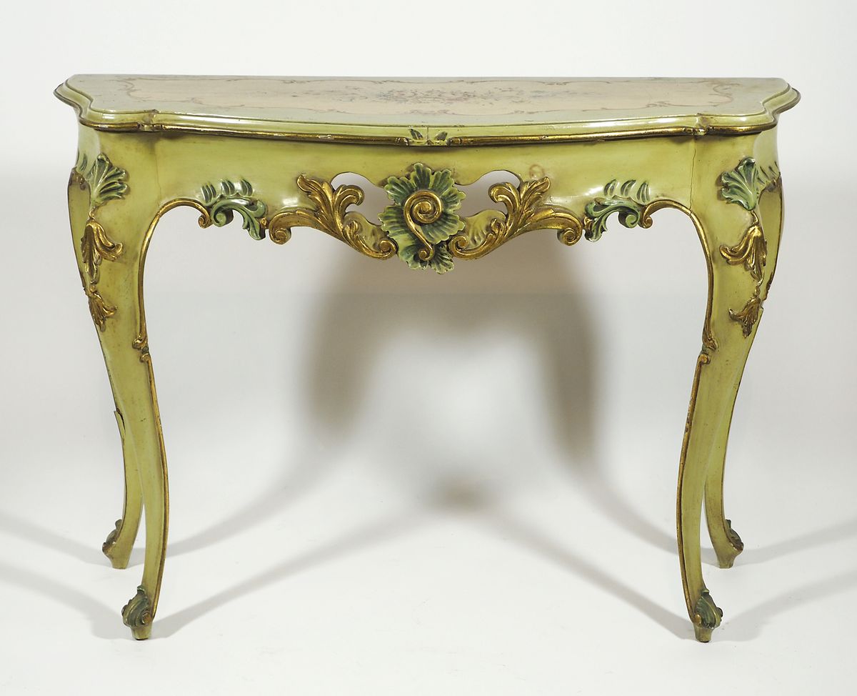 Consolle in legno dorato e dipinto a motivi floreali con specchio sagomato....
