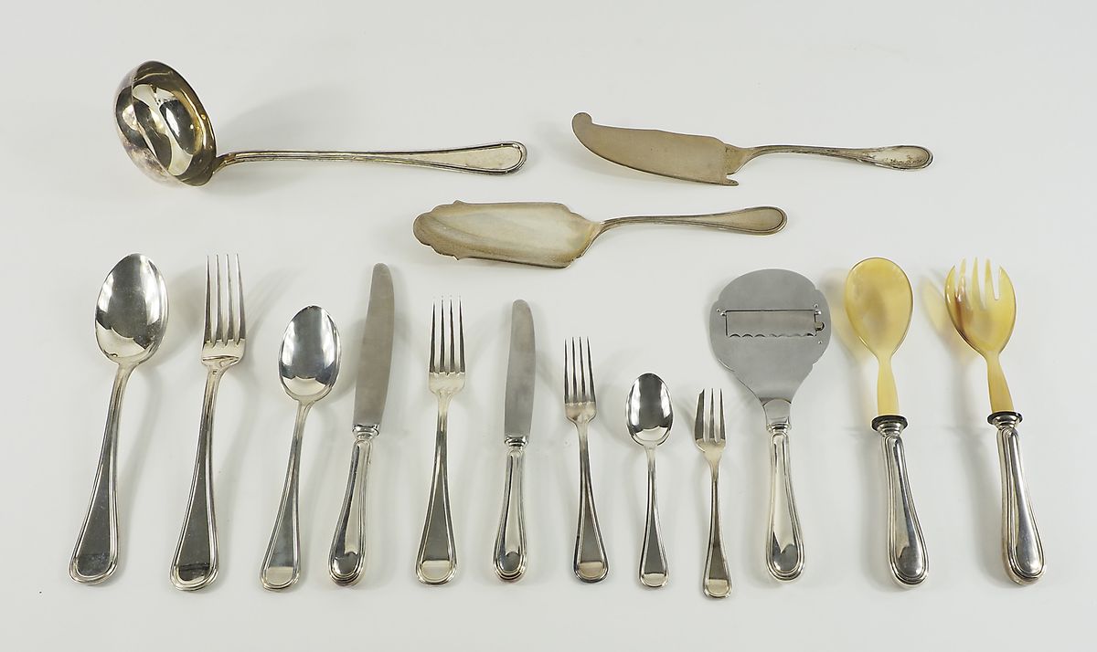 Servizio di posate in argento per 12 persone composto da 104 pezzi. gr. 4300.