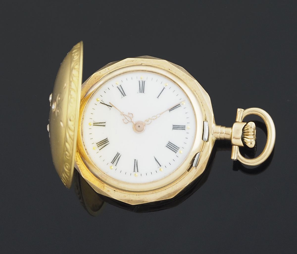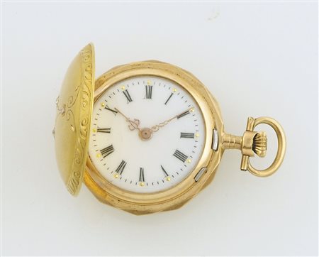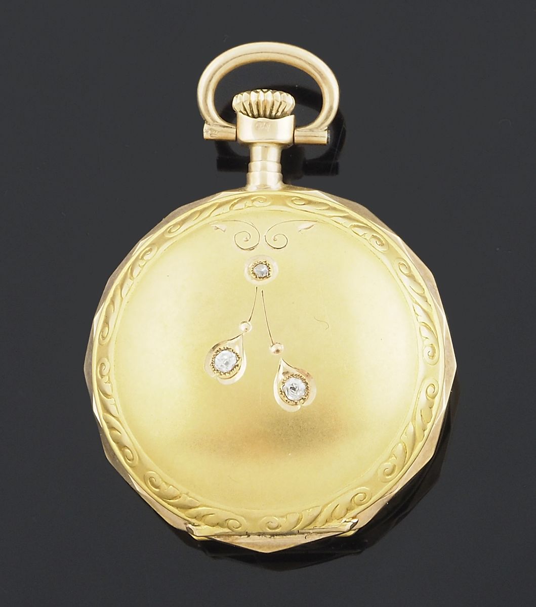 Piccolo orologio da tasca in oro 14Kt con brillantini. Diam. cm. 2,8.