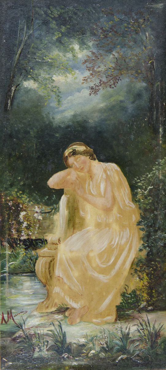 Augusto Moriani (?) "Donna in riposo" cm. 48x23 - olio su tavola Firmato b. a s.