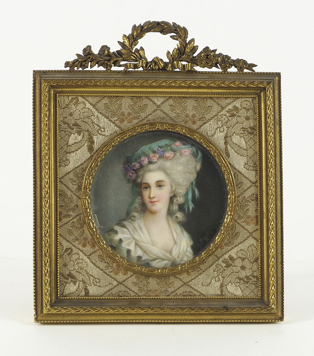 Miniatura dipinta raffigurante gentildonna entro cornice da tavolo in bronzo. H. cm. tot 14.