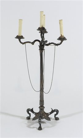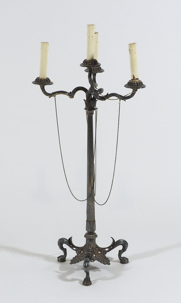 Grande candelabro in metallo argentato a 4 fiamme, trasformato a lampada. H....