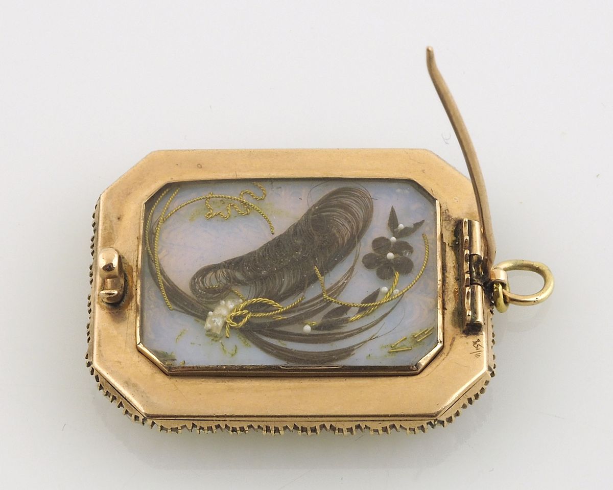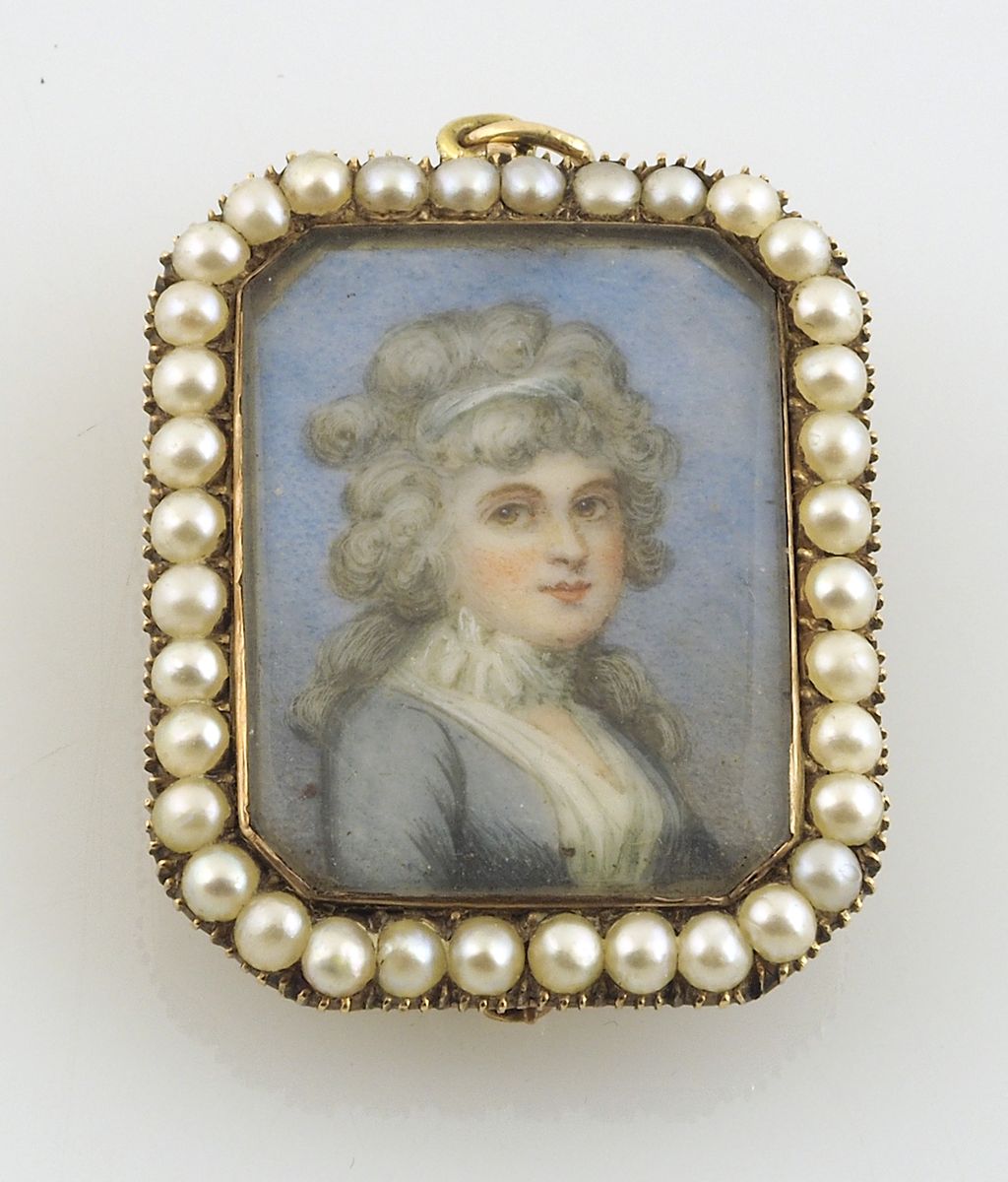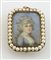 Pendente miniatura con montatura in oro giallo raffigurante gentildonna, cornice di perline, metà XIX secolo