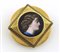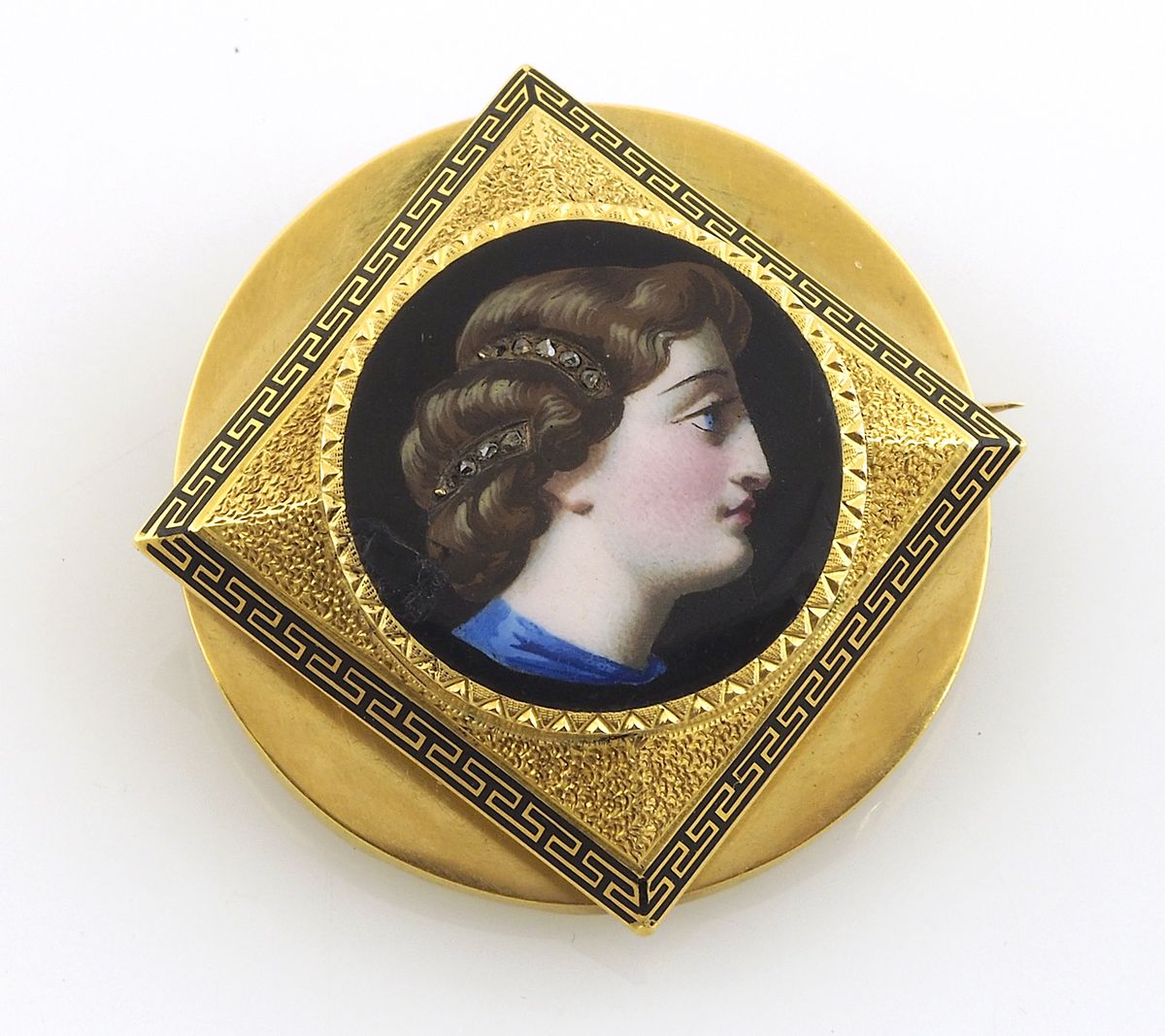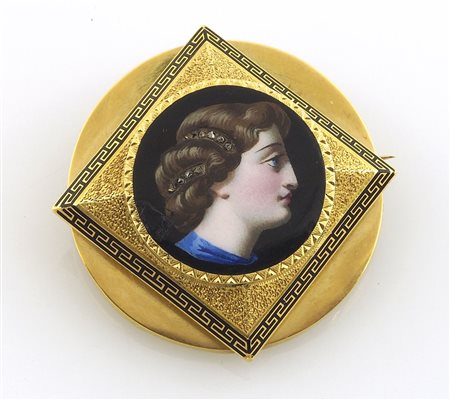 Ciondolo spilla in oro giallo, al centro figura di gentildonna in smalto entro riquadro con cotorno smalto nero con motivo a greca. Metà XIX secolo