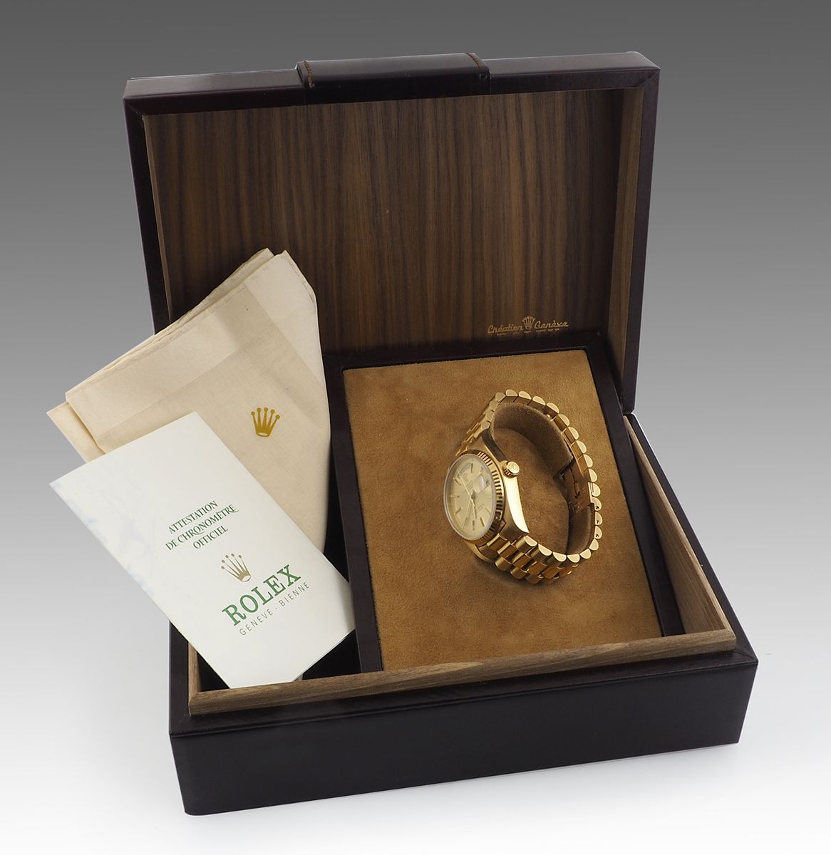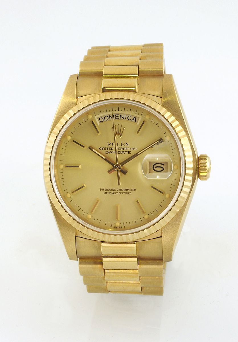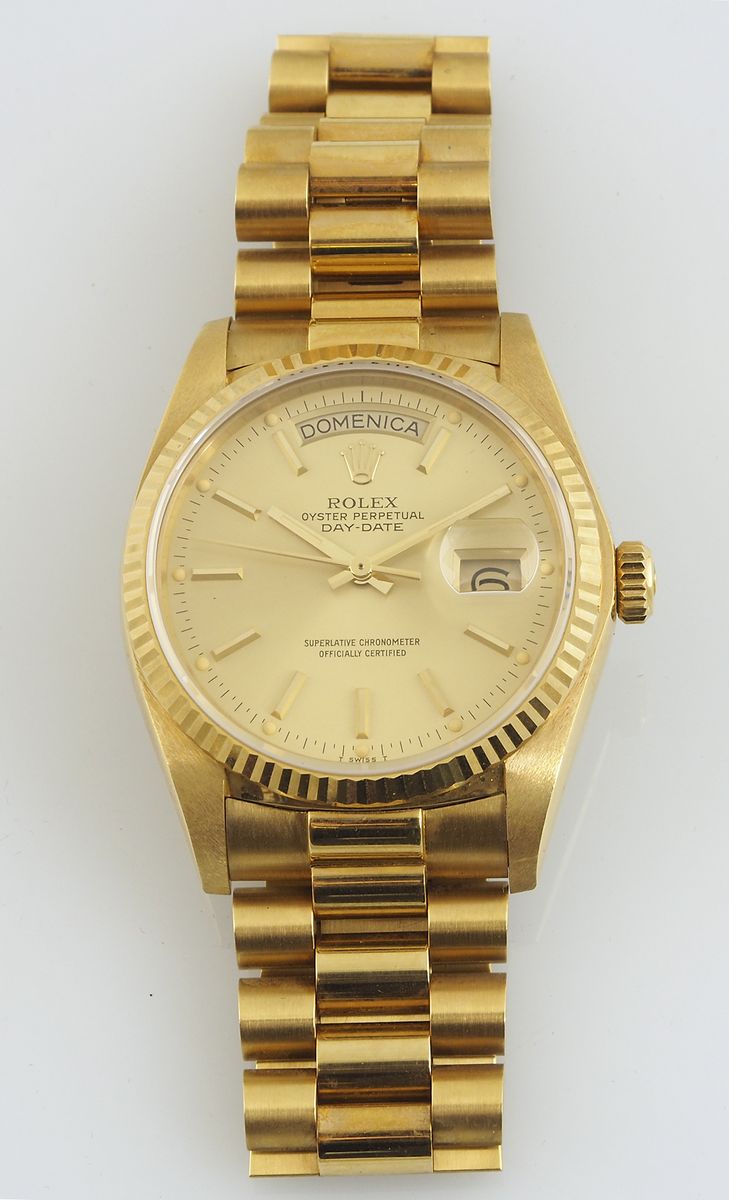 Rolex: orologio da polso in oro giallo modello daydate. Diam. 36mm. Con scatola e garanzia datata 1982.