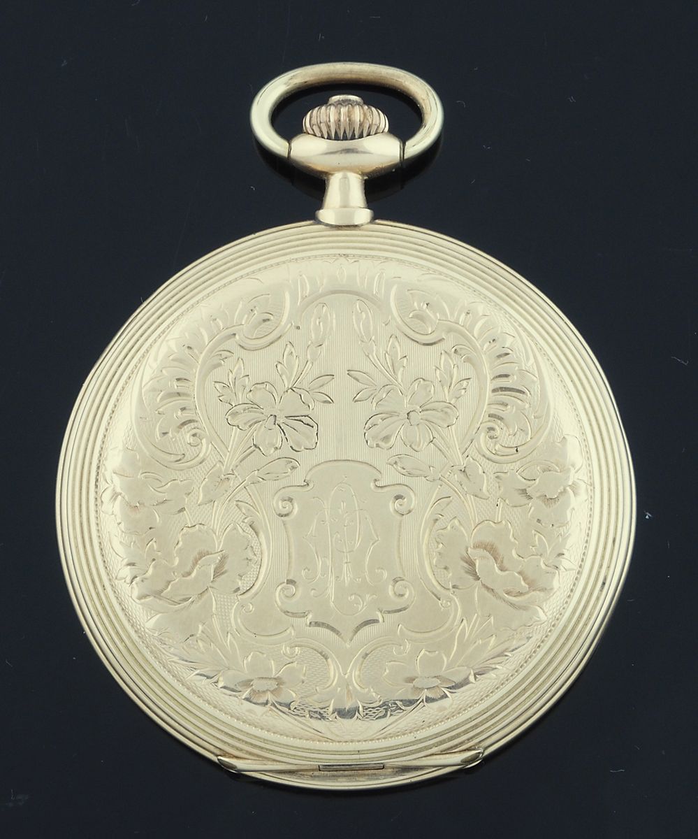 Orologio da tasca in oro 14Kt a tripla cassa, quadrante bianco con secondi al 6. Diam. cm. 5. (vetro mancante).