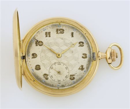 Orologio da tasca in oro 14Kt a tripla cassa, quadrante bianco con secondi al...