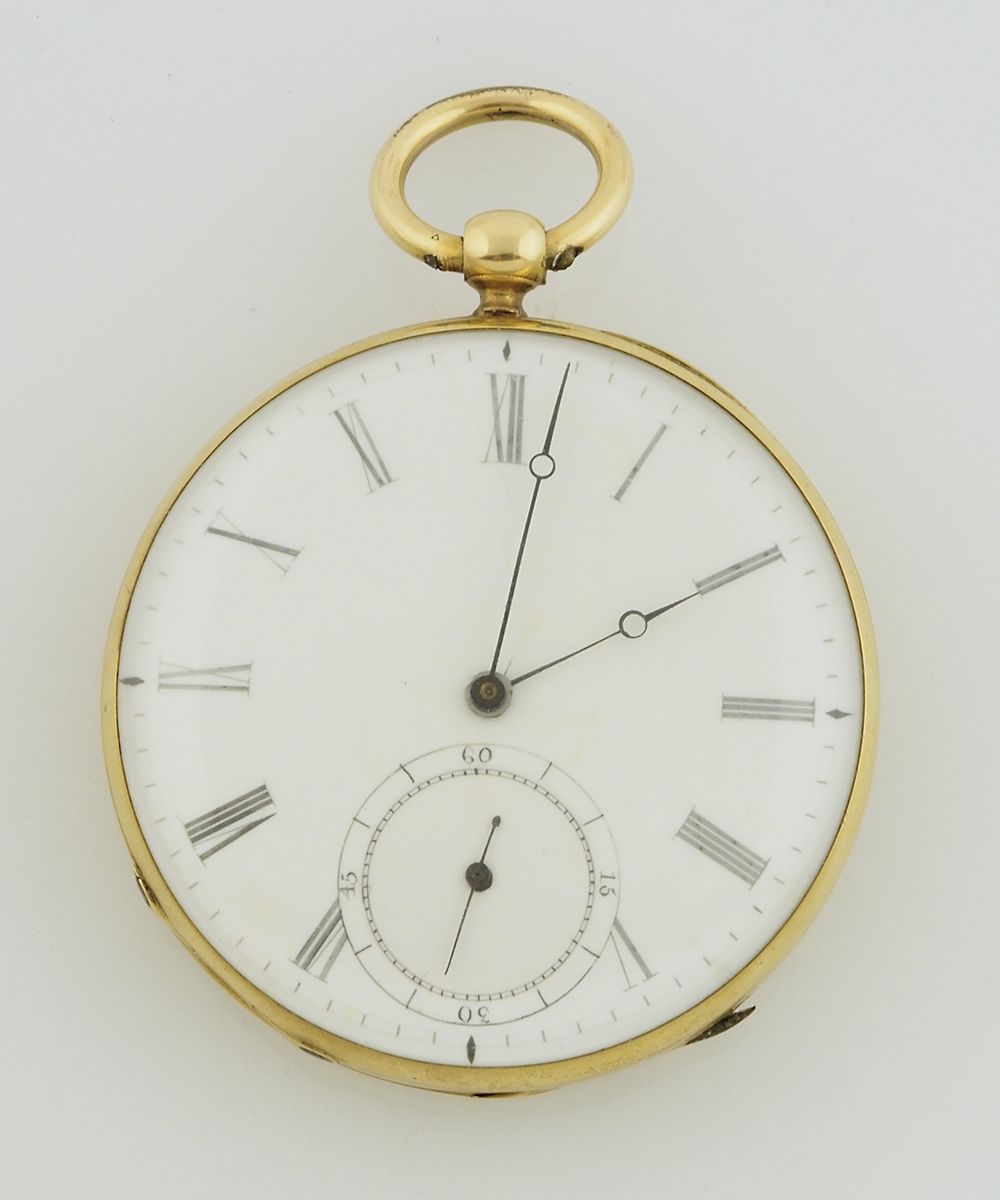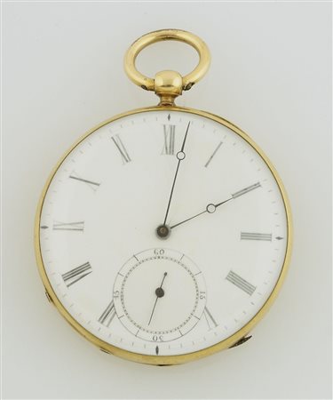 Orologio da tasca in oro 18Kt, quadrante con numeri romani e secondi al 6. Diam. cm. 4,5.
