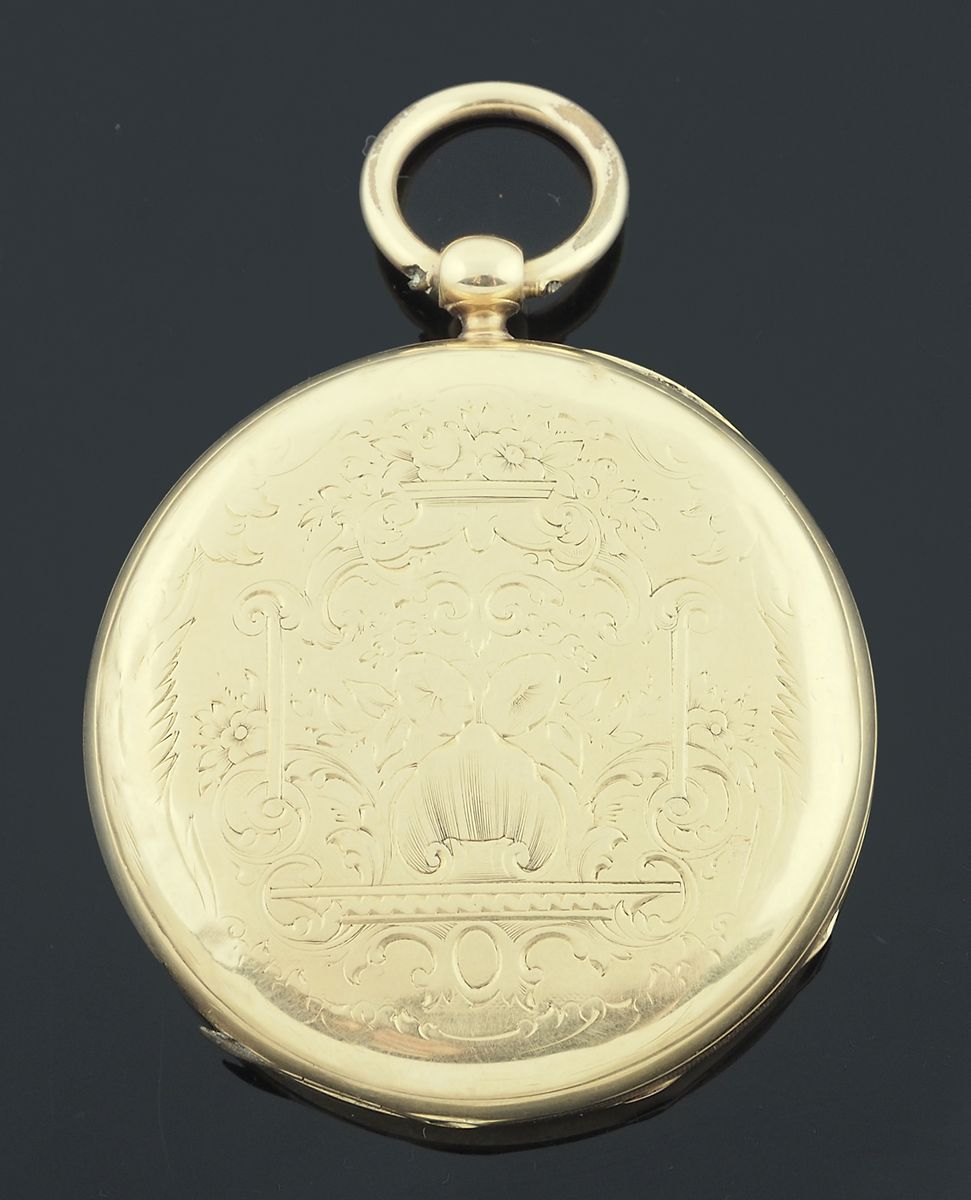 Orologio da tasca in oro 18Kt, quadrante con numeri romani e secondi al 6....